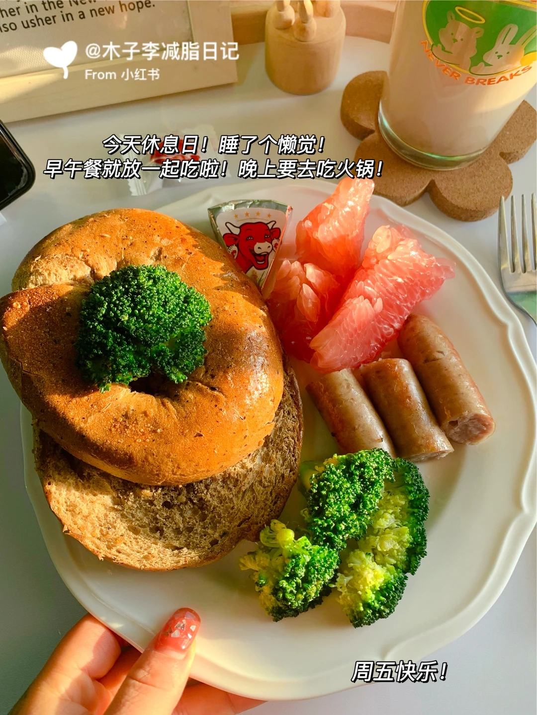 🍳早午餐:红茶贝果➕椰汁拿铁➕西蓝花➕肉肠➕柚子➕奶酪➕红枣软糖