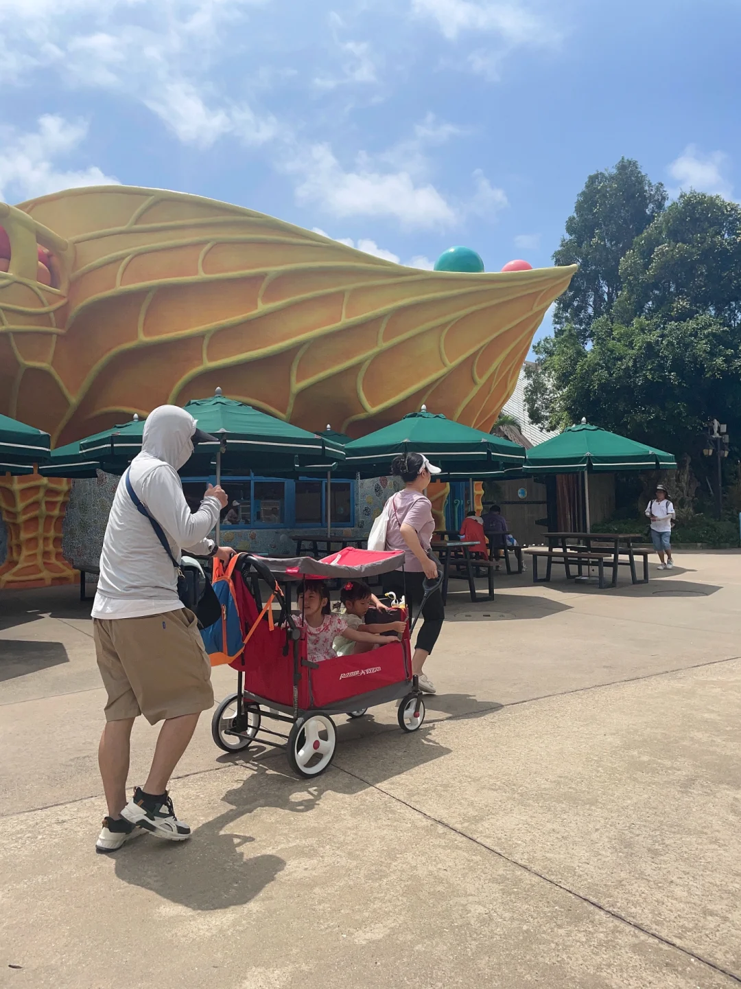 太晒太热孩子走不了一会儿就要抱,太费爸妈了