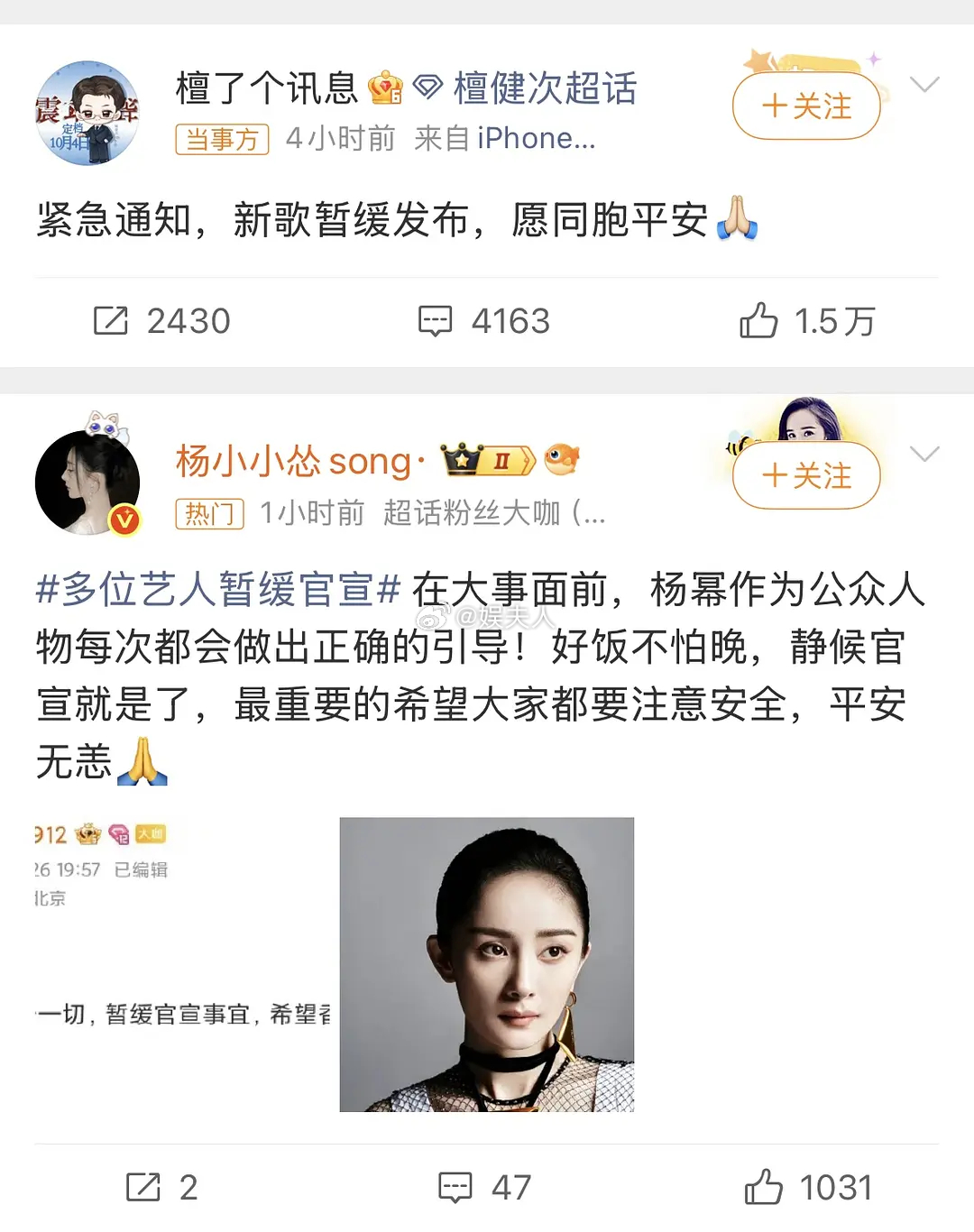 多位艺人暂缓工作官宣,杨幂,檀健次,田曦薇等