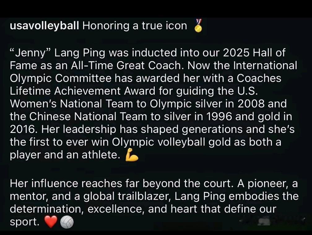 郎平获国际奥委会终身成就奖,她曾带领美国女排获得奥运会亚军,带领中国女排获得冠军,人家美国排协豆发文祝贺了,我们的排协呢?