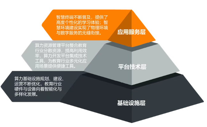 2.剖析算力+教育产业链各级特征。算力赋能教育产生的产业由基础设施层、平台技术层以及应用服务层组成,其中主要企业包括教育信息化企业、互联网企业、智能硬件厂商、电信运营商、ict设备厂商、智慧教育产品开发企业等多种类型,不同类型企业基于各自的技术优势和研发能力在算力赋能教育方向推出各类产品以及服务。基础设施层,算力基础设施向着“资源集中化”“场景智能化”“服务生态化”演进,硬件与设备正从单一性能竞争转向场景化、生态化、可持续化的综合能力比拼。平台技术层覆盖范围不断扩张,技术支撑能力持续增强,并且不断向集中化发展。应用服务层,服务模式的不断创新推动教育应用形式更加多样化。