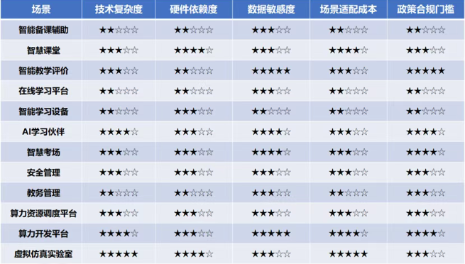 3.梳理算力赋能教育行业典型应用场景。“算力+教育”的应用场景通过归纳主要分为四大部分,分别为教学场景、学习场景、管理场景以及科研场景,由于不同应用场景之间存在差别以及技术层面的不同,因此不同场景的部署难度以及技术成熟度存在差异性。部署难度方面,不同应用场景下,“算力+”的赋能模式需要结合技术复杂度、硬件依赖度、数据敏感度、场景适配成本以及政策合规情况进行部署难度的判断,对四大类场景中的12个具体场景进行多维度的分析。
