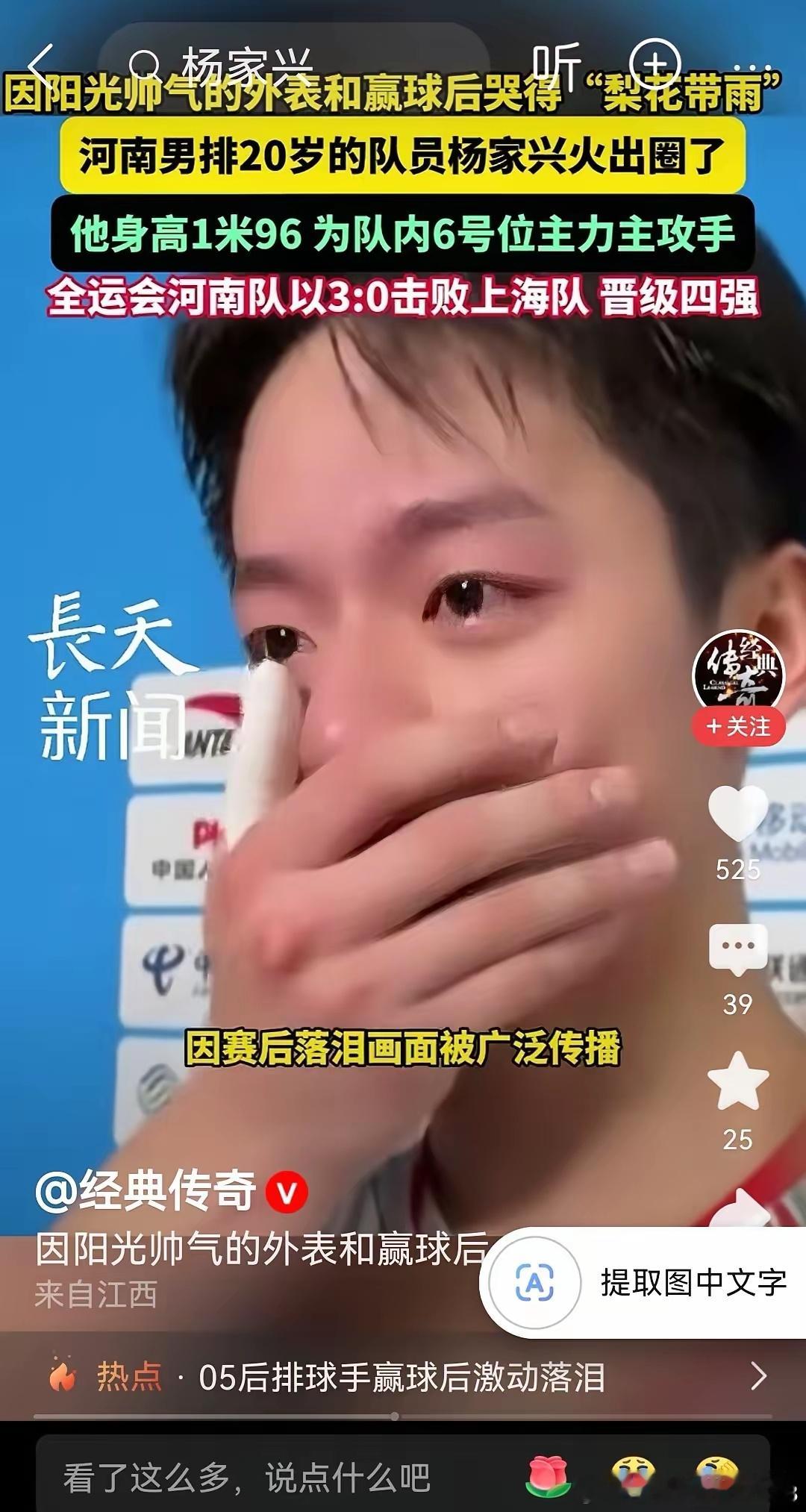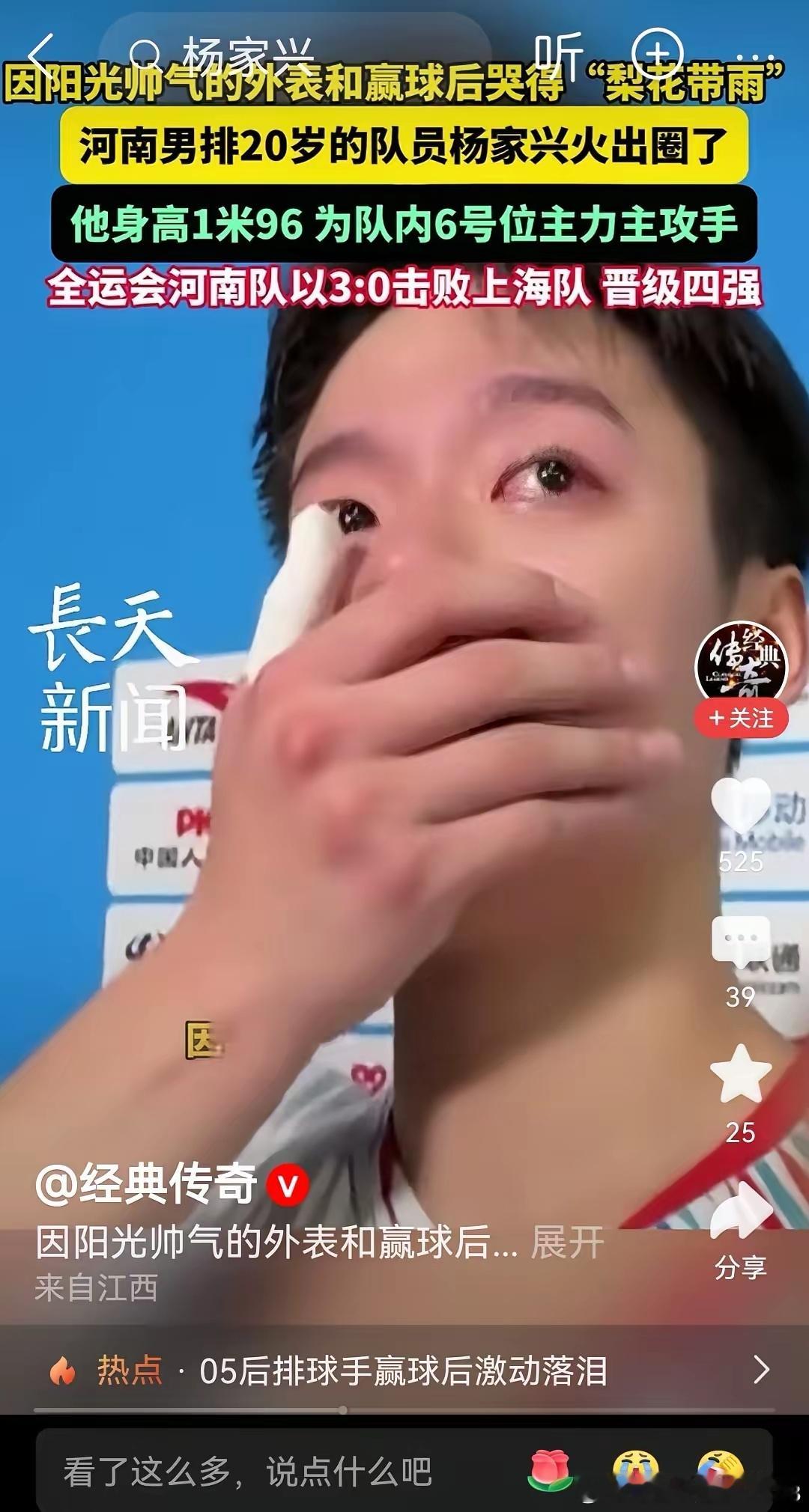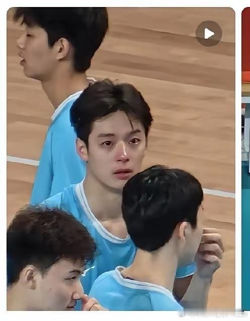 说实话,我就是因为图一的颜值点进去的,才知道了男排运动员杨家兴。突然理解老爷们看到软萌妹子流泪会心软的感觉了。因为哭得梨花带雨,我见犹怜,05年河南小将杨家兴火出圈。可能年纪小,泪点低,比赛打到一种状态,氛围上来,忍不住会哭。可以看出来,队员都很友善,纷纷来安慰他。评论区的安慰也不少