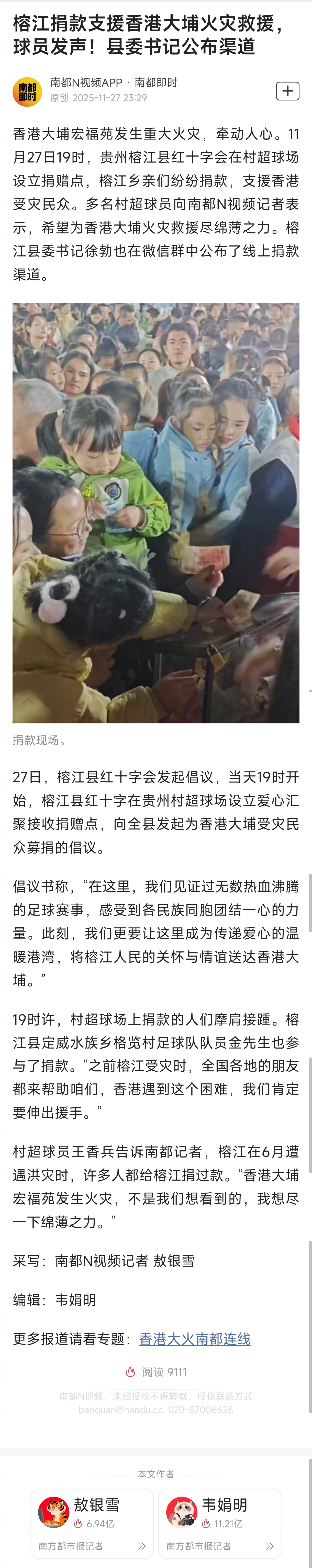 【#榕江捐款支援香港大埔火灾救援#,球员发声!县委书记公布渠道】香港大埔宏福苑发生重大火灾,牵动人心。11月27日19时,贵州榕江县红十字会在村超球场设立捐赠点,榕江乡亲们纷纷捐款,支援香港受灾民众。多名村超球员向南都N视频记者表示,希望为香港大埔火灾救援尽绵薄之力。榕江县委书记徐勃也在微信群中公布了线上捐款渠道。27日,榕江县红十字会发起倡议,当天19时开始,榕江县红十字在贵州村超球场设立爱心汇聚接收捐赠点,向全县发起为香港大埔受灾民众募捐的倡议。倡议书称,“在这里,我们见证过无数热血沸腾的足球赛事,感受到各民族同胞团结一心的力量。此刻,我们更要让这里成为传递爱心的温暖港湾,将榕江人民的关怀与情谊送达香港大埔。”