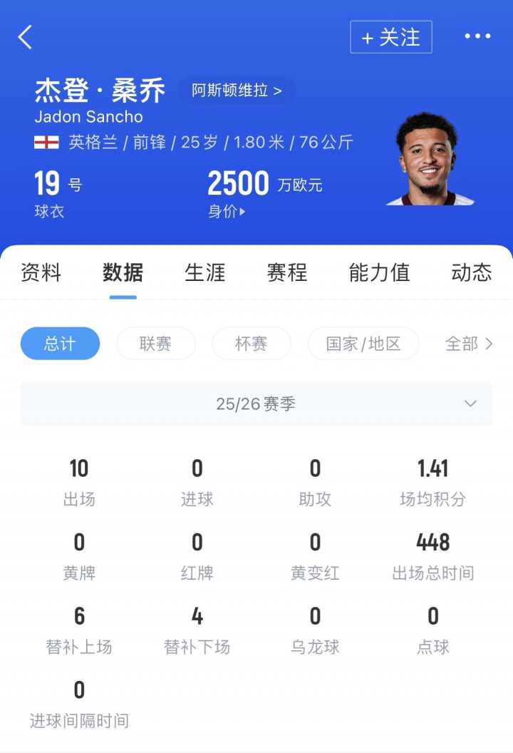 今夏租借维拉至今,25岁的桑乔各项赛事出场10次,0球0助处境尴尬。此前据《邮报》的报道,桑乔租借期间,维拉需承担其25万英镑周薪的80%(即20万镑)。