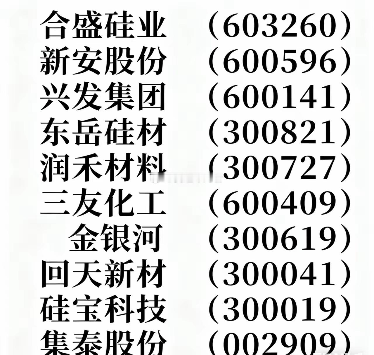 挖到有机硅赛道10只潜力股!附核心逻辑拆解(短线交易参考)有机硅作为新材料领域的"万能材料",广泛应用于新能源、电子、建筑等热门赛道,近期随着行业需求回暖+政策利好加持,相关概念股备受资金关注。整理了10只各细分领域龙头标的,从产业链布局、核心优势等维度拆解,供大家短线布局参考~1. 合盛硅业(603260):有机硅行业的"全能选手",不仅业务链覆盖最完整,工业硅和有机硅产能更是双双稳居行业前排,规模优势直接拉满。2. 新安股份(600596):国内有机硅单体生产老二,从硅矿冶炼到下游制品加工的全产业链布局,自主可控能力强,抗风险能力突出。3. 兴发集团(600141):磷化工龙头跨界有机硅,独特的"矿电硅磷"产业链模式,成本优势明显,目前有机硅产能正逐步释放,增长潜力可期。4. 东岳硅材(300821):专注有机硅材料的"技术派",在单体合成技术上有自己的独门秘籍,研发实力支撑产品竞争力。5. 润禾材料(300727):聚焦有机硅深加工赛道,产品精准切入纺织、皮革等细分领域,手握多项专利,技术壁垒稳固。6. 三友化工(600409):多元化发展的"综合型选手",粘胶短纤、纯碱等四大主业协同发力,氯碱化工全产业链为有机硅业务提供强大支撑。7. 金银河(300619):有机硅生产设备的"隐形冠军",高温硫化硅橡胶生产成套设备等核心产品,直接对接上游生产企业,赛道稀缺性高。8. 回天新材(300041):工程胶粘剂龙头,有机硅胶粘剂在光伏、新能源汽车等热门领域吃得开,市场竞争力实打实。9. 硅宝科技(300019):有机硅密封胶领域的"专家",产品横跨建筑、电子、汽车等多个场景,应用场景广,需求稳定性强。10. 集泰股份(002909):有机硅密封胶和水性涂料双赛道领先,产品性能能打,市场占有率常年保持高位,细分领域话语权足。⚠️ 风险提示:以上仅为个人对有机硅概念股的梳理分析,不构成任何投资建议。A股短线交易受行业周期、市场情绪等多重因素影响,入市需谨慎,决策前务必做好充分调研~
