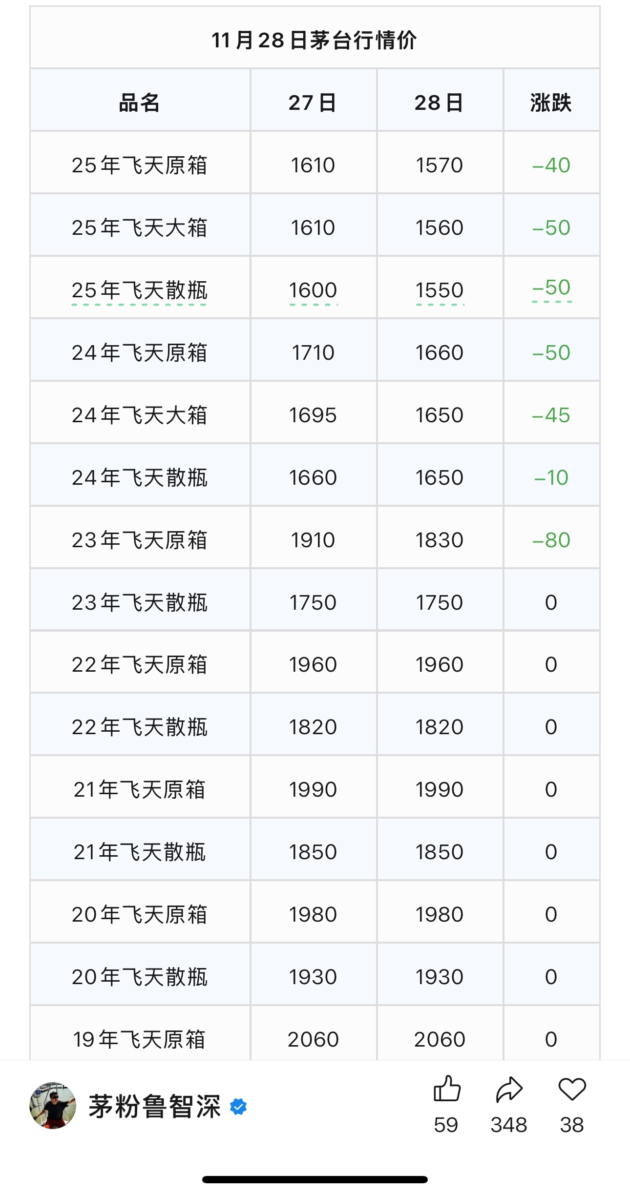 茅台酒行情价继续下跌,飞天茅台已经跌破1600元了,目前1550元,距离茅台官方