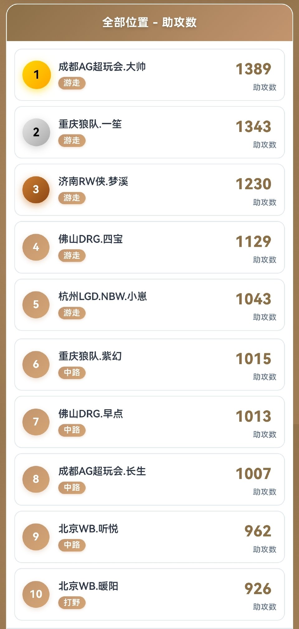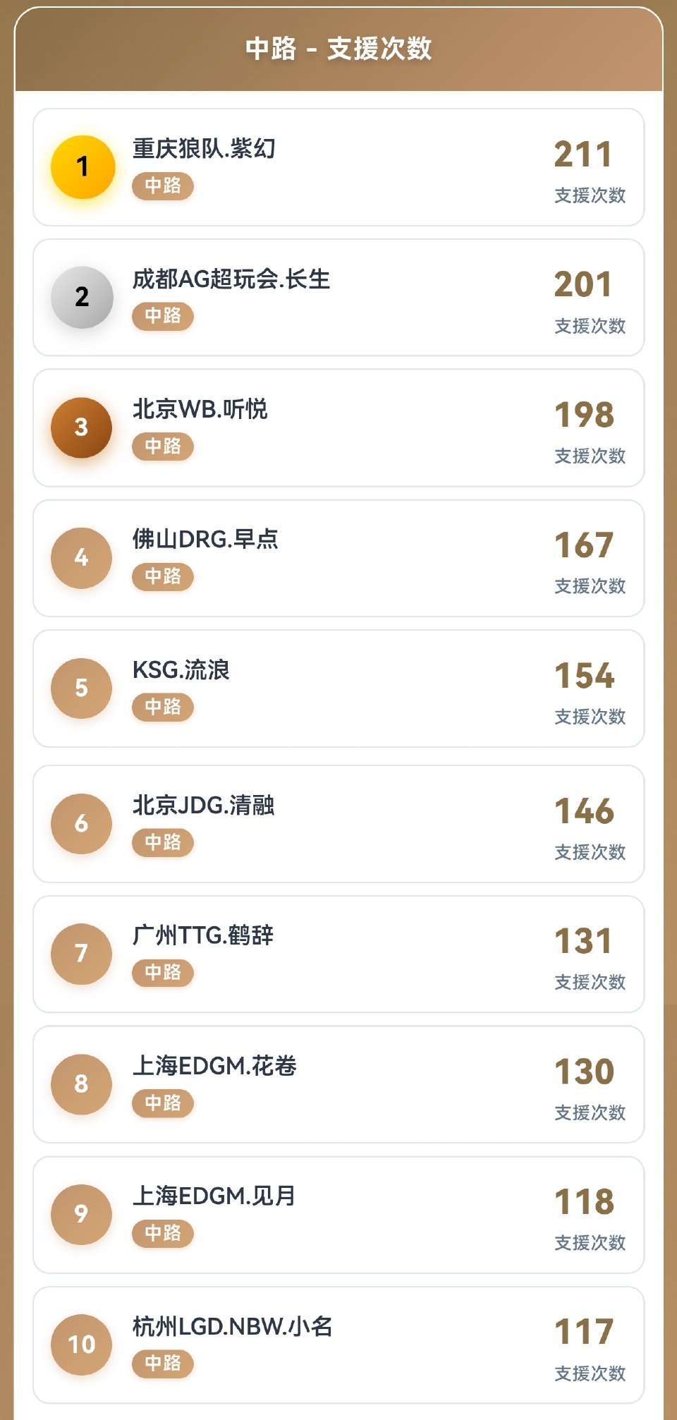 2025年度王者荣耀KPL全年数据单项奖-中路支援榜