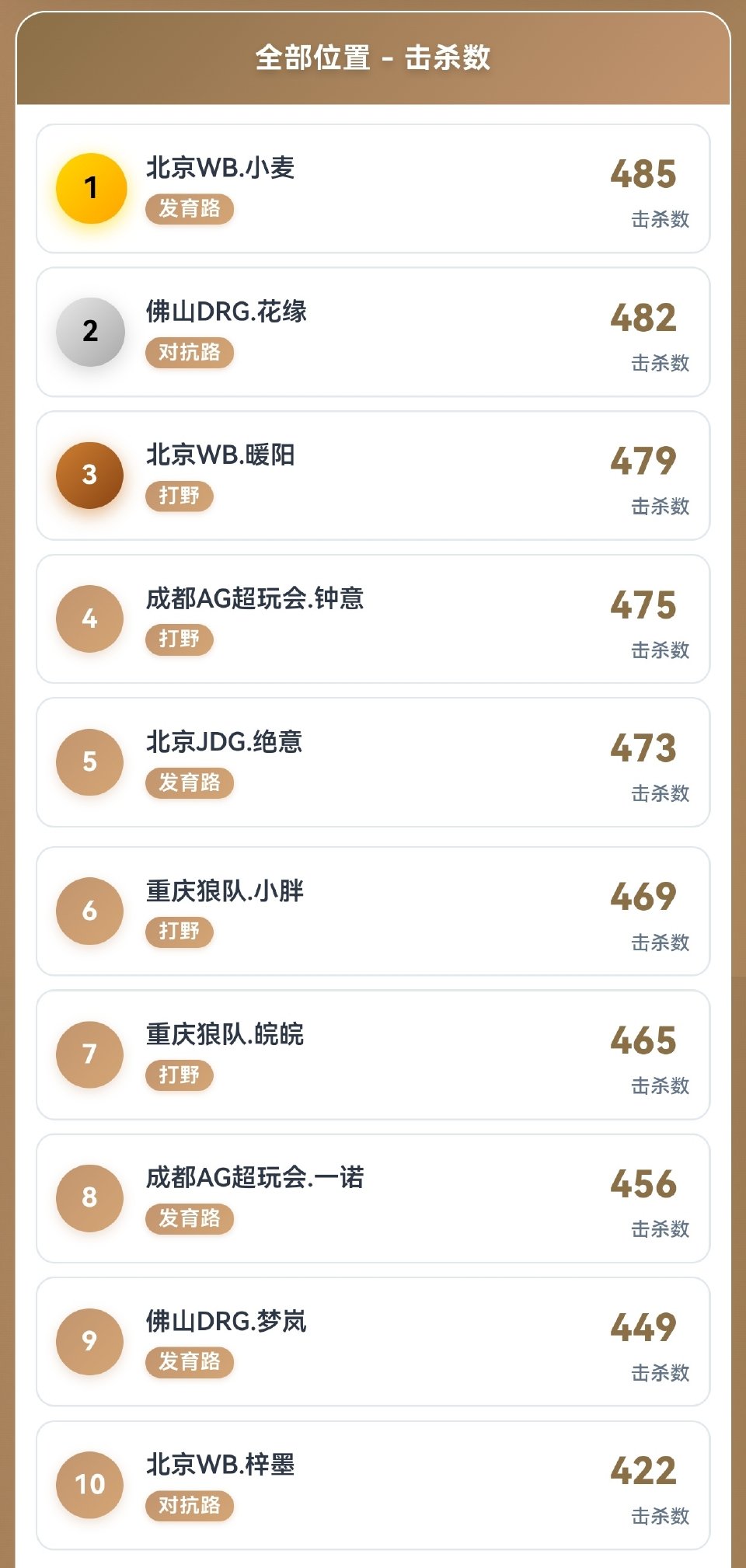 2025年度王者荣耀KPL全年数据单项奖-击杀最多