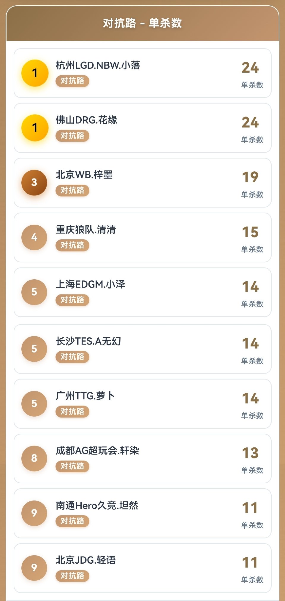 2025年度王者荣耀KPL全年数据单项奖-对抗路单杀榜