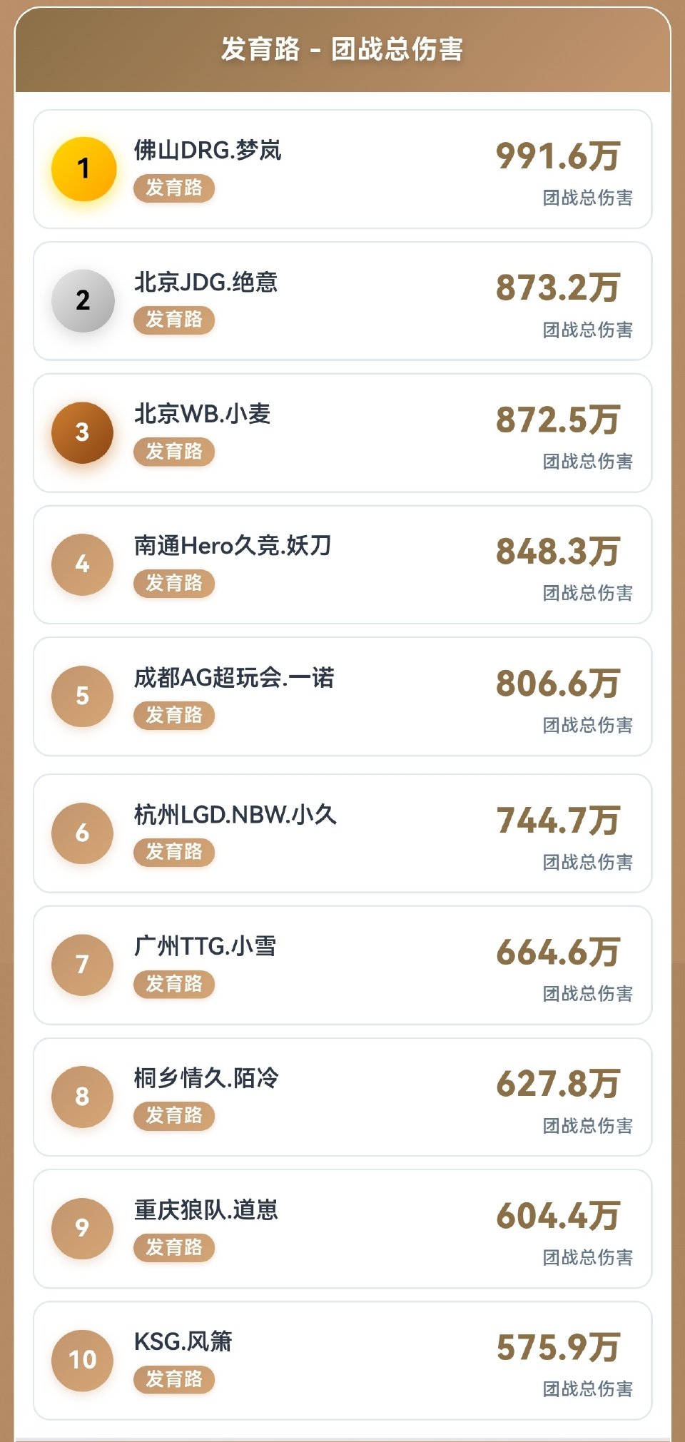 2025年度王者荣耀KPL全年数据单项奖-发育路团战伤害榜