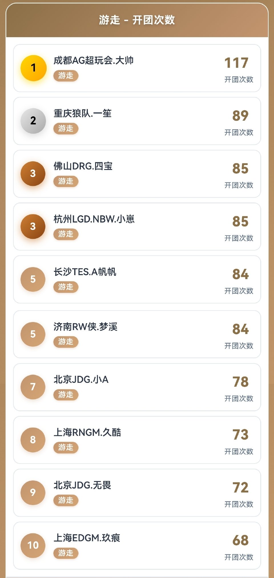 2025年度王者荣耀KPL全年数据单项奖-游走开团榜