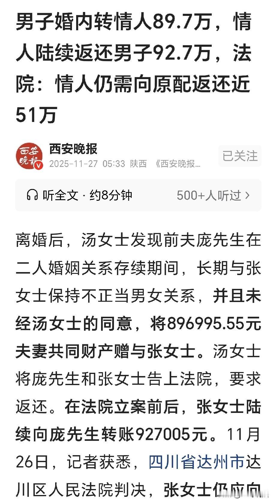 四川达州,一女子离婚后发现,前夫在婚内赠于晴人89万,女子一气之下,将前夫和晴人告到法院,要求返还夫妻共同财产,法院一查,晴人曾经给前夫转过387005元,并且在立案期间,晴人又返还给前夫54万,这样一算,返还的钱还比得到的钱还多出了来了3万,谁知法院的判决却令晴人傻眼了! 2007年底,汤女士和庞某领证结婚,日子一过就是十几年过去。 起初的时候,俩人也曾幸福美满,可是随着时间的推移,汤女士发现丈夫庞某对她的态度越来越冷淡。 之后几年,二人几乎无话可说,庞某在外面做着生意,拿回来的钱也没见有多少。 汤女士过得越发的委屈求全,吵也吵了,闹也闹了,眼泪哭干,还是无济于事。 汤女士不知道庞某一天到晚都在外面忙些什么,即便是公司再忙,家里的事情也该放在心上。 可是庞某在外干啥,汤女士根本就不知道,庞某我行我素,他啥都不说,汤女士追问,他立刻就走。 2024年8月,两人终于走到了散场,俩人决定离婚,一起去办理了离婚手续。 离完婚后,汤女士很不甘心,十几年的婚姻,自己付出的太多太多,她也听到了一些风言风语,据说丈夫在离婚前就和一个女子长期保持了不正当的男女关系。 汤女士这才明白,为何丈夫不愿回家,原来他空闲的时候,全都是和别的女子待在一起。 多年的夫妻情分他毫不在意,汤女士又开始调查丈夫离婚之前的财务流水。 这一查她才知道,丈夫庞某不但和女子张某有不正当的联系,还把他们夫妻共同财产,偷偷转给了对方近90万元。 汤女士简直惊掉了下巴,自己在生活中省吃俭用,虽然丈夫开公司赚了不少的钱,但是汤女士知道,这钱也是来之不易。 汤女士默默的站在他身后,一直以来都支持着丈夫的事业,家里有老有小,没有汤女士的照顾,庞某哪有时间在外面安心的打拼? 汤女士的心彻底沉了下去,庞某转账的方式有通过V信、支 .付 .宝等方式,还有银行直接的对张某进行转账。 这些账目加在一起,具体算下来是896995.55元。 这些转账里,满是都是他们之间嗳 昧的痕迹,不少是1314、520、666.66、888.88这样的特殊数字。 另外还有几笔大额转账,上面备注着七夕节快乐,永远爱. 你!永远你都是个宝……等等话语。 那字里行间,都是庞某对张某的情意,他却全然忘记自己家里还有的妻子! 汤女士泪眼婆娑,想到自己多年的付出和被侵犯的财产权益,汤女士决定拿起法律武器。 汤女士一纸诉状,把庞某张某一起告上法院,要求张某返还财产! 法院查明,在立案前后,张某也分几次给庞某转了钱。 最早在2019年11月和2023年11月,她就转了387005元。 2025年的时候,案件已经进入了诉讼程序,开庭前一天、开庭当天以及之后几天,她又陆续给庞某转了54万元。 这样一算,张某前后加起来一共给庞某转了927005元,比以前收到的896995.55还多了3万。 法院审理认为,庞某在婚姻期间,没经过汤女士同意就擅自处分夫妻共同财产,把钱赠与张某,不仅侵犯了汤女士的财产权,还违反了公序良俗,这种赠与行为根本就是无效。 按照法律规定,张某从这种无效行为中获得的财产,本来就该全额返还。 至于张某已经转给庞某的92万多,法院也做了区分:立案前转的387005元,是她自己主动处分财产。 张某转给庞某的38万,也确实减少了当初不当获得的数额,这部分可以从该返还的总额里扣除。 但是,重点来了,立案后转的54万元,并不能算在返还给汤女士的款项里。 之所以这么判,是因为汤女士已经通过诉讼保全主张了自己的权利。 张某这时候还偷偷把钱还给庞某,根本没考虑汤女士的合法权益。 而且庞某和汤女士离婚后,还存在抚养费和财产纠纷。 他的不少银行账户因为其他执行案件被冻结,收到张某的54万后,既没用来履行法定义务,也没和汤女士协商处理,反而转给了其他公司。 要是这部分钱也抵扣,汤女士的权益就没法保障。 《民法典》第1062条规定:夫妻在婚姻关系存续期间所得的生产、经营、投资的收益等财产,为夫妻的共同财产,归夫妻共同所有;夫妻对共同财产,有平等的处理权。 庞某婚内转给张某的89万余元,来自其经营生意的收益,属于夫妻共同财产。 他未经汤女士同意,用这笔钱维系和张某不正当的关系,是擅自处分共同财产,因此被认为是无效赠与,应当返还。 既然庞某的赠与行为无效,张某就应返还全部获赠财产。 张某在立案前返还的38万余元,是主动减少不当所得,可抵扣应返还款。 而立案后返还的54万元,是张某明知汤女士已主张权利,仍擅自转给庞某。 此时庞先生身负纠纷且有转移款项行为,若抵扣会导致汤女士权利落空。 因此,法院不认可这部分款项的抵扣效力。 最终,法院判决,张某在扣除立案前返还的38万多后,还得向汤女士返还509990.55元。 关注@王哥说法 多学法律少吃亏!