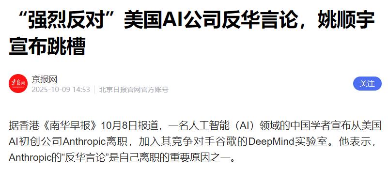 反华言论遭反噬!清华AI天才愤然离职,抗议将中国列为敌对国家。 27岁的姚顺宇可不是普通的技术从业者,而是AI圈里响当当的顶尖翘楚。他本科毕业于清华大学,后来拿下麻省理工学院博士学位,年纪轻轻就已经在AI核心技术领域深耕多年,一手过硬的研发能力让他成为行业内稀缺的“技术大神”。 毕业后,姚顺宇加入了美国AI巨头Anthropic公司,负责关键模型的研发工作,是团队里不可或缺的核心力量,这样的人才无论放在哪个企业,都是重点培养的对象。 今年9月,这场原本顺风顺水的职业旅程突然画上句号,姚顺宇毅然决然地递交了辞职信。这波操作不是一时冲动,背后藏着一场原则之争。 根据Anthropic内部流出的文件以及路透社的报道,这家公司近期在决策中明显偏向地缘政治偏见,甚至直接将中国列为“敌对国家”,在技术合作、项目参与等方面设置了诸多歧视性限制。 对姚顺宇来说,科学研究本就该秉持“无国界”的初心,技术的价值在于推动人类进步,而不是被当成政治博弈的工具。面对企业这种违背行业共识的做法,他不愿妥协,最终选择用离职的方式表达抗议,这既是对自身原则的坚守,也是对企业政治化行为的公开反对。 姚顺宇的选择并非个例,近年来不少美国科技企业都在走“政治化”的弯路。 比如某知名芯片公司,之前为了迎合地缘政治需求,盲目限制对华技术出口,结果不仅丢了中国这个庞大的市场,营收大幅下滑,还因为失去了持续的研发资金支持,技术迭代速度明显变慢。 某AI创业公司,曾因为不合理的国籍限制,逼走了好几位华人顶尖工程师,导致核心项目停滞了近一年,原本的行业领先优势直接被竞争对手赶超。 这些例子都说明,科技企业追求技术领先和商业成功没问题,但一旦被地缘政治偏见牵着鼻子走,后果只会得不偿失。 AI行业的竞争,本质上就是人才的竞争,像姚顺宇这样的顶尖人才,走到哪里都是香饽饽。Anthropic放走这样一位核心研发人员,不仅是团队实力的直接损失,更会让其他华人人才对这家公司望而却步,长期来看,人才流失的连锁反应会严重影响企业的创新能力。 更有意思的是,技术本身是没有国界的,强行给技术贴上政治标签,只会让自己陷入发展困境。 中国有庞大的AI应用市场和丰富的人才储备,全球科技企业本来可以通过合作实现共赢。可有些企业偏偏要搞对立,把潜在的合作伙伴当成“敌人”,这种做法不仅违背了商业逻辑,也不符合科技发展的规律。 姚顺宇的离职已经给这些政治化的科技企业敲响了警钟,再执迷不悟下去,只会在错误的道路上越走越远。 能留住顶尖人才的,永远是尊重技术、尊重人才的环境,而不是狭隘的政治偏见。