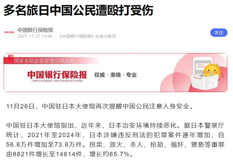 多名旅日中国公民遭殴打受伤!   最近这段时间,在日本的中国同胞可真是有些提心吊胆。中国驻日本大使馆在11月26日晚间再次发布了安全提示,里面说得明明白白,日本的治安环境这些年一直在走下坡路。   从2021年到2024年,涉嫌违反刑法的犯罪案件从56.8万件一路涨到了73.8万件,像拐卖、杀人、抢劫这些重罪更是涨了六成多,想想都让人后怕。   尤其从今年7月开始,使馆接到的中国公民被歧视类案件求助就明显多了起来,到11月份因为中日关系类似的事情更是集中爆发。   好几起中国同胞在日本街头遭到无端辱骂甚至殴打受伤的事情,发生之后使馆和各总领馆第一时间就去慰问帮忙,还向日方提出交涉,要求尽快破案严惩凶手。   可让人窝火的是,目前这些案子大多还没破,施暴者依然逍遥法外。也难怪使馆会郑重提醒大家近期尽量别去日本,已经在那边的同胞更得时刻绷紧安全这根弦。   要说这事儿可不是凭空出现的,背后跟日本政府近期的一系列操作脱不了干系。日本首相高市早苗前段时间在国会公然把"台湾有事"和日本行使集体自卫权扯到一起,这可是1945年以来头一回有日本领导人敢这么明目张胆地在台湾问题上发出武力威胁。   今年正好是中国人民抗日战争胜利80周年、台湾光复80周年,这种时候说这种话,简直是在往中国人民的伤口上撒盐。   中方的反应那也是相当强硬,外交部副部长和驻日大使都"奉示"召见日方官员,这种表述在外交场合可是极为罕见的,意思就是咱们的态度是代表更高层级的,绝对不会含糊。   而且各方都明确表态,要是日方真敢在台海问题上动武,中方必将"迎头痛击"。这可不是说说而已,现在教育部、文旅部都发了预警,航空公司也给涉日航线开了免费退改通道,就是要保障中国公民的安全和利益。   其实日本国内也有不少人看不下去,前首相鸠山由纪夫就公开说台湾问题是中国内政,日本不该插手。还有不少民众在首相官邸前抗议,喊着"高市下台""反对战争"。   可高市政府这么一折腾,不仅让中日关系紧张,还让日本自己吃了大亏。光是中国游客取消的赴日机票就超过54万张,年底前旅游业可能要损失12亿美元,水产品出口也暂停了,股市更是接连大跌。   中方已经把话摆得很清楚了,如果日方还一意孤行、一错再错,那主张正义的国家和人民自然有权利清算日本的历史罪行,坚决不让军国主义死灰复燃。   历史教训就在那儿摆着,要是真把中方逼急了,日方恐怕只会吃不了兜着走。