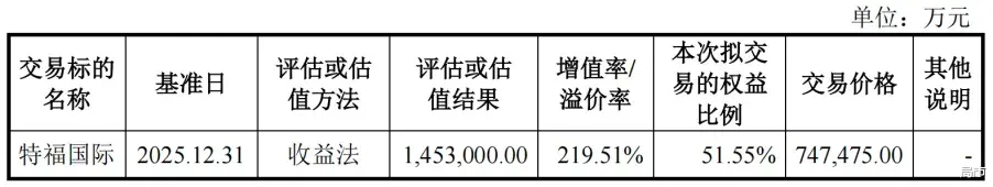 根据评估报告,特福国际归属于母公司股东的权益账面价值为45.48亿元,采用收益法评估后的股东全部权益评估价值为145.3亿元,评估增值率219.51%。双方协商确定100%股权交易作价为145亿元。