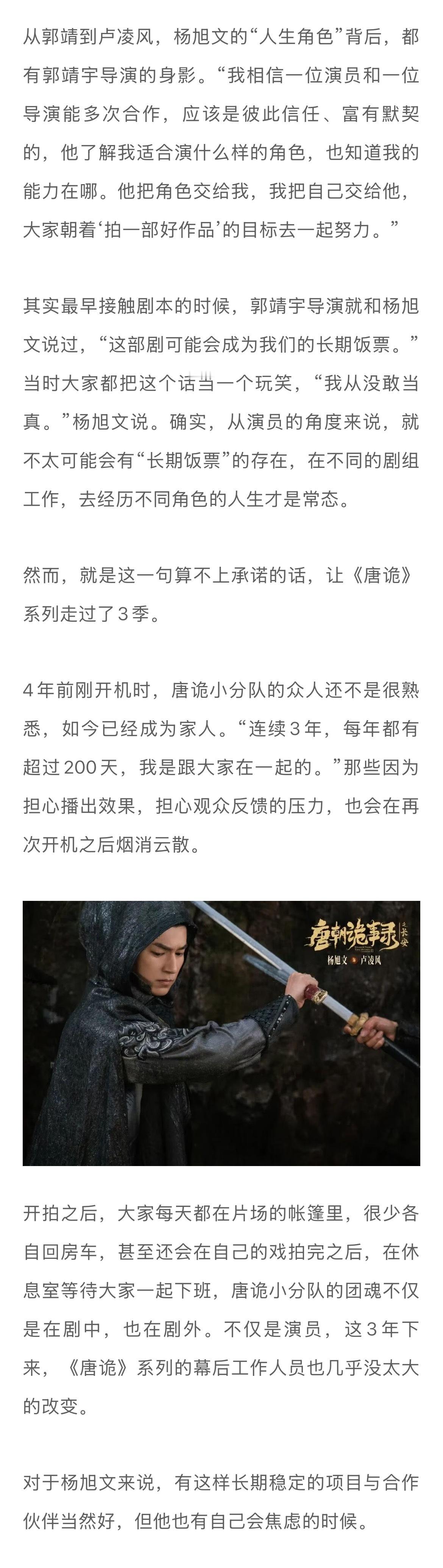 杨旭文说不是演而是成为卢凌风杨旭文因唐诡打戏眼角受伤 谈及《唐朝诡事录》和导演郭靖宇,直言:“从当初的《射雕英雄传》到现在的《唐朝诡事录》,郭靖宇导演对我来说就是伯乐。”三年前见到郭靖宇时,杨旭文没有询问导演为什么会再次想到自己,郭靖宇直接告诉他,“卢凌风这个角色非常适合你。”最早接触剧本的时候,郭靖宇导演就和杨旭文说过,“这部剧可能会成为我们的长期饭票。”当时大家都把这个话当一个玩笑,“我从没敢当真。”然而,就是这一句算不上承诺的话,让《唐诡》系列走过了3季。杨旭文形容自己和卢凌风的关系,“已经不是照着剧本演,而是我已经成为那个人了。”观众喜欢看卢凌风的打戏,杨旭文就豁出命去拍摄。“我们拍摄十几个小时的武打戏,再加上炎热的天气,还要穿厚厚的戏服,有时候就会崩溃。”每到这时,武术导演就会和杨旭文说,“我了解你,你做得到。”杨旭文的眼角下有一处新伤,就是拍摄《唐朝诡事录之长安》时留下来的,“有些受伤是在所难免的”…娱理独家↓