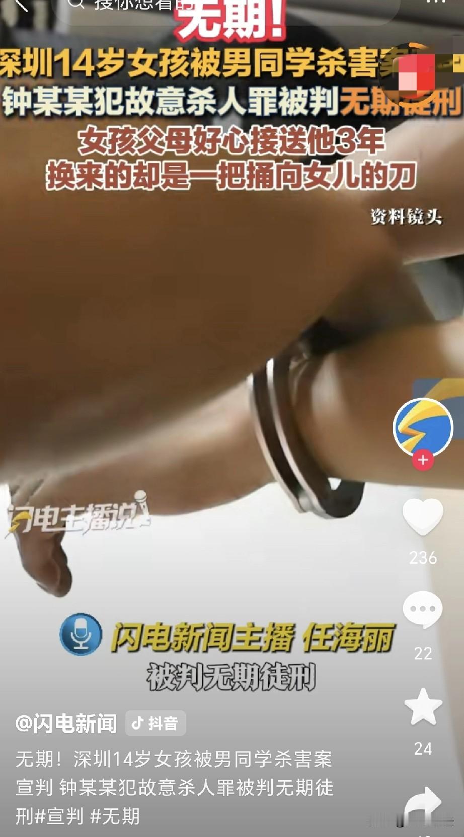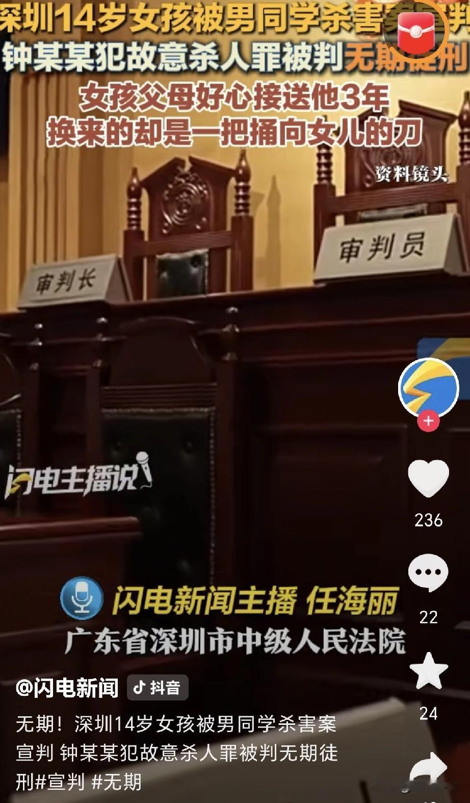 广东深圳,一初三女生和两个同学住同一小区,其中一男同学嫉妒女生学习好,家境也比他家好,他买了把刀子,等在女生楼下,女生正准备上楼,男同学上去捅她数刀,女生呼救,男同学又拐回,朝她脖子又捅数刀,之后他刀子一扔,一溜烟跑了,之后男生被捕,女生死亡,男生满不在乎,反正他只有14岁,还想回校正常生活,家长要求判他死刑,他因为怕死,立刻跪下求饶,法院的判决令他没有想到! 钟某、潘某某还有陈某住在同一个小区,又在一个班上课。 初一的时候,三家家长商量,由陈某和潘某某的爸爸,轮流接送3个孩子。 家长们认为,邻里之间,互相帮助,这是合理的安排,能够节约家长的时间,又能保证孩子们的安全。 潘某某妈妈没有多想,她家孩子是个女孩,潘某某乖巧懂事,学习一直名列前茅。 谁知同行的男生钟某心里不平衡了,他不光嫉妒潘某某的成绩,还羡慕她的家境比自己家好。 他心里有个念头,总是觉得潘某某看不起他,这种不满日积月累,钟某想起来就心里难受。 可是他表面装的若无其事,每天家长接送他们,也没发现他有什么异常。 随着时间的推移,他的不满越演越烈,他没想着好好沟通,反倒动了不好的心思。 转眼来到3年之后,这段时间之内一直相安无事,可潘某某万万没有想到想到,危 险已经一步步的靠近。 钟某提前网购了一把折叠刀,他把刀子揣在怀里,还特意搜了14周岁杀人需要承担什么责任,显然就是早有预谋。 2025年4月8号,下午放学,陈某的爸爸把3个孩子送到小区门口,他开车走了,以为孩子们会各自回家。 谁知潘某某和陈某一起走进小区,陈某回了自己家的楼栋。 钟某没跟他们一起同行,而是绕了另一条路,先回了自己楼栋附近等着。 他翘首以盼,就盼着潘某某单独出现,果然没过多久,潘某某一个人走到了自家楼下。 钟某拿着事先准备好的刀子走了过去,先是质问了潘某某几句,接着就直接持刀朝她捅刺。 潘某某猝不及忙,瞬间就栽倒地上,钟某不仅没停手,反而朝她要害部位连捅几刀。 他捅完之后,试图逃跑,跑出去之后,听到潘某某大声呼救。 他又折返回来,跪压在潘某某身上,朝着她的脖子又捅数刀! 之后他匆忙离开,扔掉刀子直接跑了,他回到家,还骗家人说自己是见义勇为,被人砍伤了双手。 潘某某的妈妈刚到家里,就听见楼下有人大喊: 有人晕倒了。 她立刻感觉到是女儿潘某某出事了,因为她之前有过低血糖也曾晕倒。 她紧张兮兮,一路小跑,迅速来到楼下,结果看到女儿躺在血泊里,当场就崩溃了。 邻居们赶来,帮忙做心肺复苏、可是已经晚了,潘某某没了呼吸,救护车赶来,潘某某还是没能挽救回来。 4月9号,警方来到医院,直接就把钟某抓了起来。 4月22号,经检察机关批准,钟某被正式逮捕。 10月15号这天,案件开庭审理,潘某某妈妈几乎崩溃,3年前那场决定家长接送孩子,她后悔莫及,痛断肝肠! 如果家长不贪图省事,3个孩子也就不会一同回家,他们之间也就很少会有交集,大概率不会发生后面的事情。 潘妈妈表示,希望能够重判,以告慰女儿,女儿在地下,才能安息。 可钟某和他的辩护律师说,钟某是长期被校园欺凌,迫不得已,才做的这种事情。 可天网恢恢,学校的老师和同学都出来作证,说实际上,是钟某经常欺负别人,潘某某和他根本没有过太大的矛盾。 庭审的时候,钟某某一副无所谓的样子,他以为自己才14岁,就是杀人也没多大事情。 他还想回学校过正常生活,他对自己杀害潘某某没半点愧疚! 直到潘某某的家人提出,要判他死刑,他才感到事情严重,扑通一声下跪求饶! 可他不是忏悔,而是怕死!他伤害潘某某时,可曾想过,那也是一条鲜活的生命! 案发后这么久,钟某一家从来没主动道歉,也没提过赔偿的事,直到开庭宣判,才在法庭上说了句“对不起”。 11月28号,深圳市中级法院做出判决。 法院认为,钟某某是预谋行凶,犯罪手段特别残忍,情节恶劣,主观恶性也深。 虽然他作案时还不满十八周岁,依法可以从轻处罚,但法院最终定格宣判:钟某以故意杀人罪判处他无期徒刑! 《刑法》第49条规定:犯罪的时候不满十八周岁的人不适用死刑。 《刑法》第232条规定:故意杀人的,处死刑、无期徒刑或者十年以上有期徒刑。 钟某作案时年满14周岁,完全符合上述法律条文的适用条件。 他提前网购刀具、搜索14周岁杀人的责任,还刻意蹲守被害人实施犯罪。 这就是说,他并非临时冲动,他对自身行为的危害有明确认知,符合故意杀人罪的构成要件,依规必须承担刑事责任。 从量刑来看,钟某未满18周岁,不适用死刑。 但考虑到钟某犯罪手段残忍,事后无真诚悔意、家属也未主动道歉赔偿,危 害极大。 因此法院判决,钟某无期徒刑! 关注@王哥说法 多学法律少吃亏!