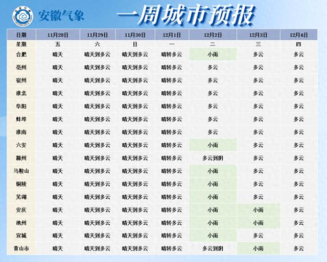 2日:淮北地区多云;淮河以南多云到阴天,部分地区有小雨,其中大别山区局部夜里有雨夹雪或小雪。
