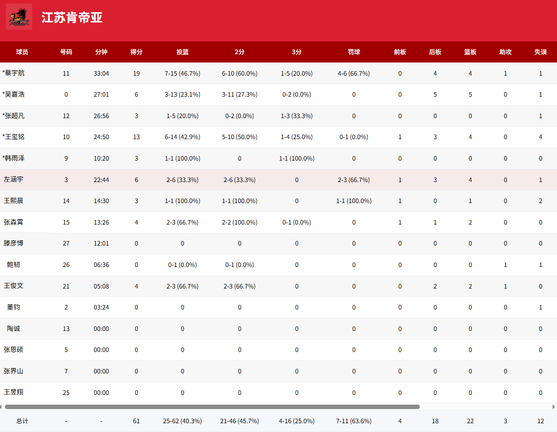 江苏:蔡宇航19分、王玺铭13分、左涵宇6分