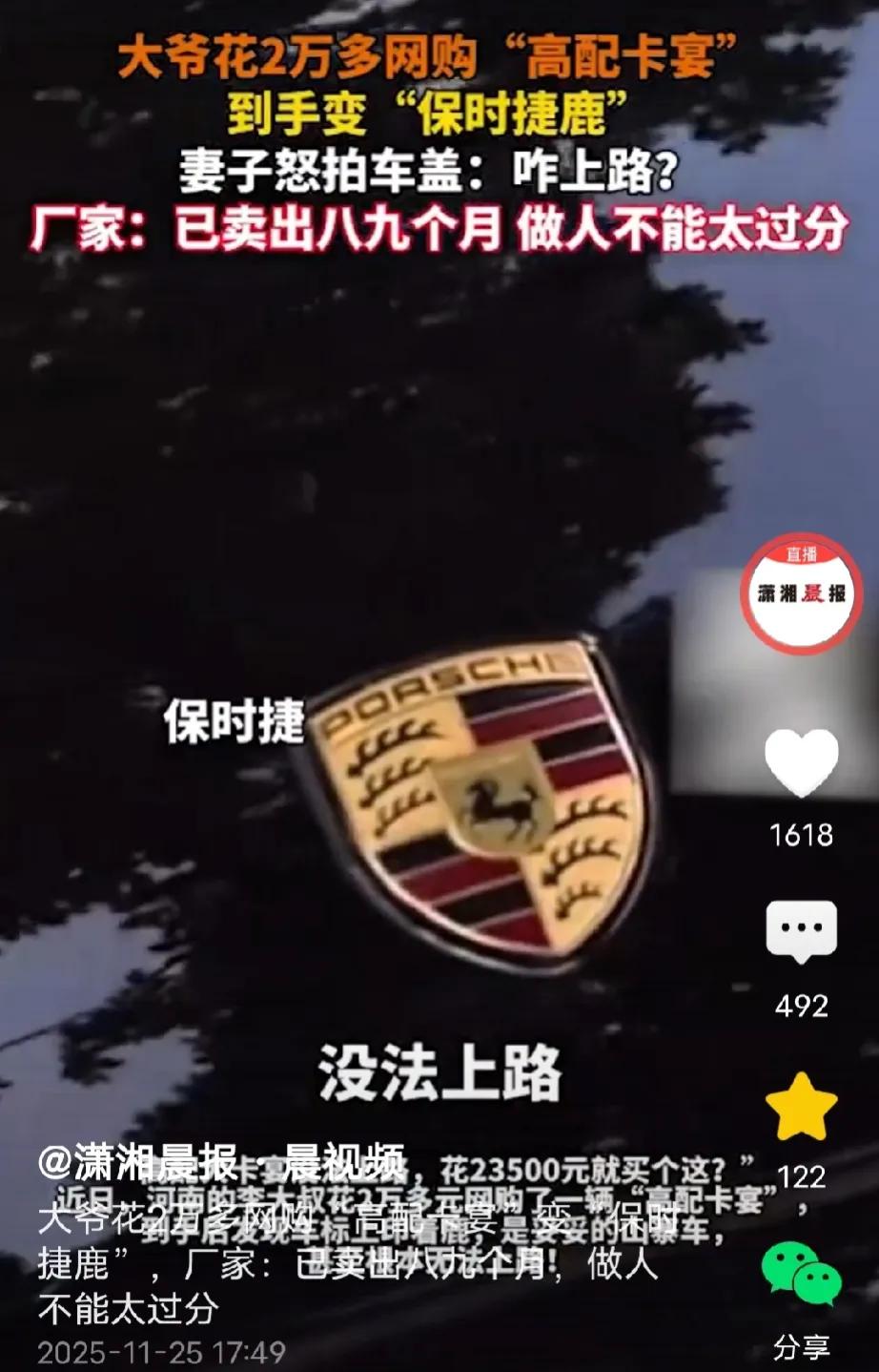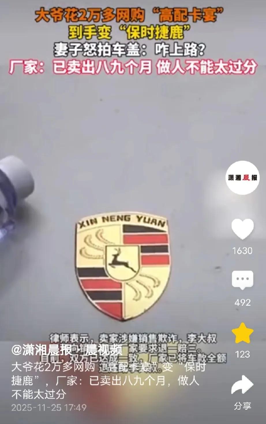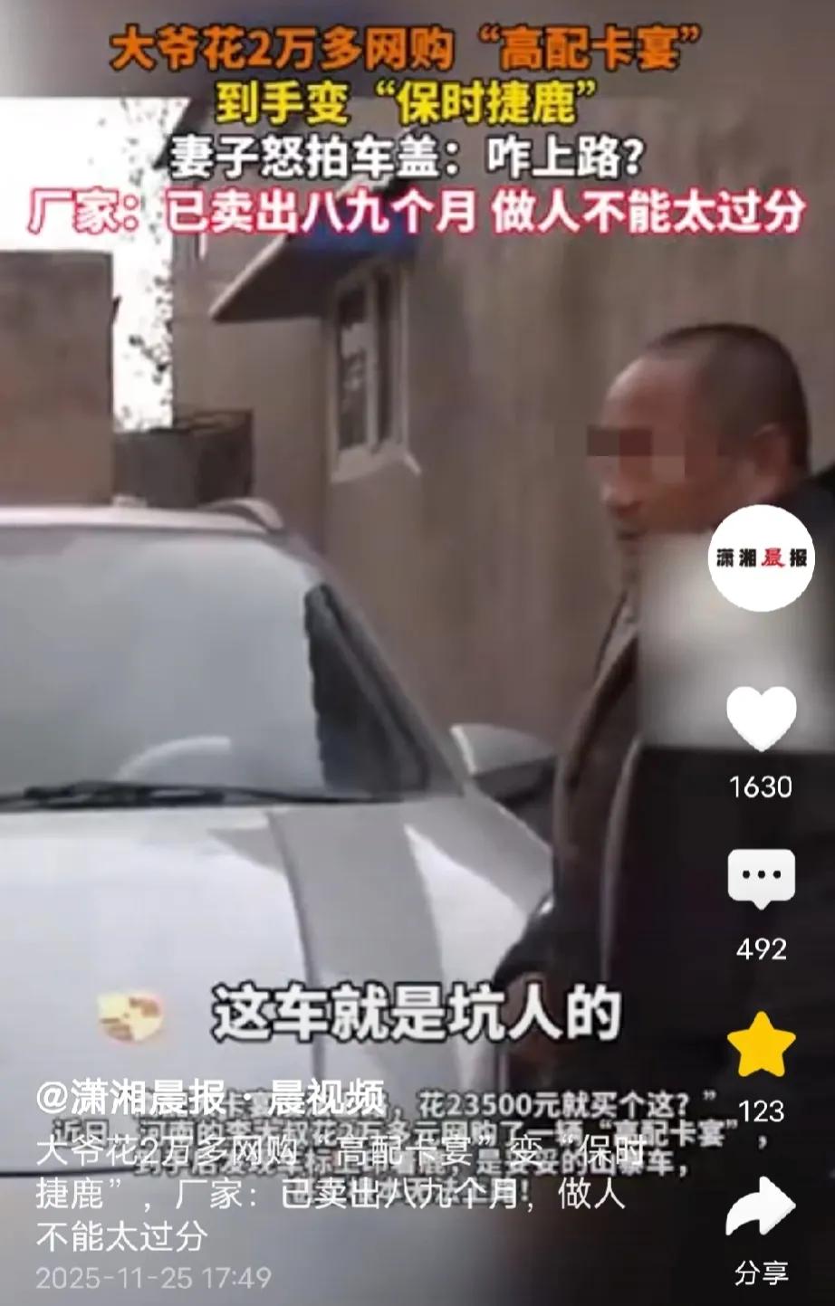 河南安阳,大爷花23500元在网上买一辆“高配卡宴”,到手后发现是“保时捷鹿”,大爷懵了,这车子是山寨中的山寨,但他没退货。开了3个月后,车子坏了,他打电话让卖家来修,卖家一直推托不来,半年后大爷要求退货退款,厂家:车子你开9个月了,要求全额退款,做人不能太过分。大爷:你车子货不对版,属于欺诈行为,我可以去告你。随后,大爷找来媒体协助,结局出人意料。 今年2月份,河南的李大爷闲来无事,拿出手机刷视频,无意中一个卖车的广告吸引了他。 那是一款老年代步车,车子看起来很漂亮,宣传广告上写着“高配置卡宴”,搞活动只要23500元。 李大爷一直想买辆代步车,一来可以接送孙子上下学,二来出去买菜的时候也方便,怎奈汽车太贵,他一直舍不得下手。 如今看到这个车子只要2万多块钱,他想到只要2万多块钱就能圆了他心中想了很久的梦,他心动了,而且这个数目对他来说,在可以接受的范围。 于是,李大爷赶紧加了对方的微信,之后通过聊天,业务员很热情地跟李大爷讲解的车子的各种性能。 其实,李大爷最关心的是车子能不能上路,因为有的老年代步车根本没法来上路,如果买来只能在自家周围转转倒不如不买。 业务员明确告诉他,可以开上路,大爷信以为真,在多次确认车子是山东某正规厂家生产的之后,他更加坚定买车的心。 随后,李大爷跟老伴商量了一下,老伴杨阿姨也支持他,于是,在当天李大爷就下单购买了。 付了款后,李大爷那个心情,就好比孩子盼着过年,一分一秒都在想着自己的爱车尽快到手。 等了几天后,车子终于寄到大爷家里了,李大爷一看那车子的外观和车型,都是自己喜欢的,可再看看那合格证上写的说明,他就有些不淡定了。 说明书上写着,该产品为非公路用车,请选择在合适的场(厂)内使用。 这车子既然不能开上路,那他去买菜接孙子用不了啊,那买来有啥用? 李大爷赶紧联系业务员,业务员回答他说,河南买车的都能开,为啥,你能不能开? 李大爷辩解说,可你合格证上明明写着,非公路用车,业务员回答他说,能不能开得看当地政策。 李大爷心想着,既然车子已经到家了,那颜色和款式自己挺喜欢,就暂且开着看看,所以他和业务员就这样终止了聊天,没再追究。 可让李大爷没想到的是,车子才开了3个月,5月份的时候,车子竟然坏了,没法开了,新买的车子才开了3个月,李大爷很郁闷,他联系业务员要求他们上门来修,但是卖家那边一直找理由推脱没来。 李大爷只好自己找人修,但这事在他心里一直过不了这个坎。 当初说好的可以开上路,可合格证上却写着非公路用车,指不定哪天真出了点事,他得负全责,而且更让他受不了的是,才开3个月车子就坏了。 李大爷想来想去决定把车子给退了,可卖家却不认账了,车子用了几个月才退,谁乐意呢,他们直接不搭理李大爷。 李大爷真气啊,错在他们,想当甩手掌柜没门,所以,他直接找媒体曝光。 记者在了解大爷的情况后,试图联系卖家,但是电话一直无人接听,记者又根据合格证上厂家的电话,拨了过去。 厂家接通了,他们在了解情况后,联系了卖家,卖家表示很无语,他对李大爷说,车子你都开了9个月了,现在要求全额退款,做人不能太过分。 杨阿姨听了直接抢过电话怼过去:“你骗了我们,说车子能上路,结果呢,到底是谁过分?” 之后卖家说,现在吵架没用,我们要想着怎么解决这个事,李大爷坚持要求全额退款给他,他把车退回去。 卖家表示,退车可以,但得算折旧费,毕竟车子开9个月了。 记者咨询了律师,律师表示,如果卖家这边确实是涉嫌销售欺诈行为,李大爷可以要求退一赔三。 最终,双方达成协议,卖家全额退款给李大爷。 于情于理,此事双方均有不妥。 卖家以“高配卡宴”“可上路”虚假宣传,售卖非公路山寨车,售后还推诿,欺诈行为明显,既违背诚信又漠视消费者权益,理应承担责任、吸取教训。 但是,李大爷明知合格证标注“非公路用车”仍使用9个月,现要求全额退款,确实有失厚道,未及时止损也让维权合理性打折扣。 最终全额退款既惩戒了商家欺诈,也给双方敲响警钟,商家需诚信经营,消费者亦应理性维权、及时止损。 那么,李大爷是否有权要求退一赔三? 《消费者权益保护法》第55条规定,经营者提供商品或者服务有欺诈行为的,应当按照消费者的要求增加赔偿其受到的损失,增加赔偿的金额为消费者购买商品的价款或者接受服务的费用的三倍。 增加赔偿的金额不足五百元的,为五百元,法律另有规定的,依照其规定。 本案中,卖家以“高配卡宴”“可上路”为噱头虚假宣传,实际售卖非公路山寨车,故意隐瞒商品真实情况,构成欺诈。 虽李大爷使用车辆9个月,但核心过错在卖家欺诈,其应承担相应责任,最终全额退款符合法律精神,若大爷主张“退一赔三”,亦有明确法律依据。 最后,诚信经营是底线!虚假宣传属欺诈,需担退赔责任,莫因贪利触碰法律红线。 @猫眼学法