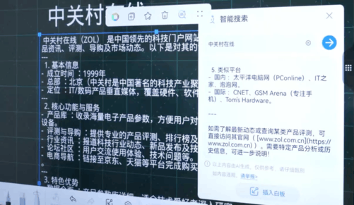 一场会议,除了播放PPT内容外,白板书写其实更为关键。在体验华为IdeaHubS3的智能白板功能后,笔者真切感受到智能化给传统白板书写带来的全新改变。在这其中,智能白板接入AI大模型的设计让我印象最为深刻。参会者可以直接在白板上通过文本形式进行智能搜索,生成的内容还能一键插入白板,开会时再也不用中途暂停去单独搜索资料,借助AI大模型就能轻松搞定,大幅提升了会议的连贯性和效率。