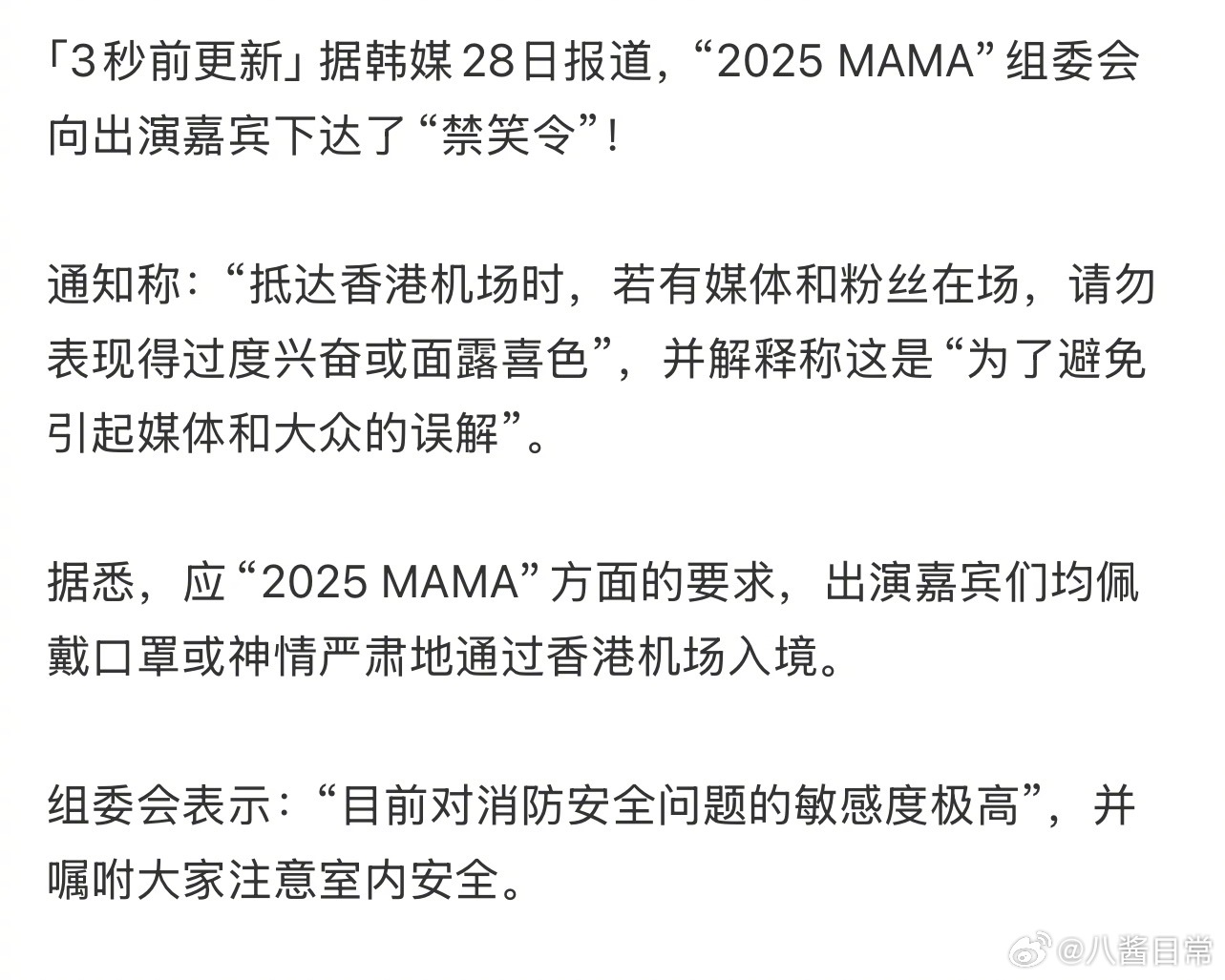 MAMA组委会向艺人下达“禁笑令”通知称抵达香港机场时,若有媒体和粉丝在场,请勿