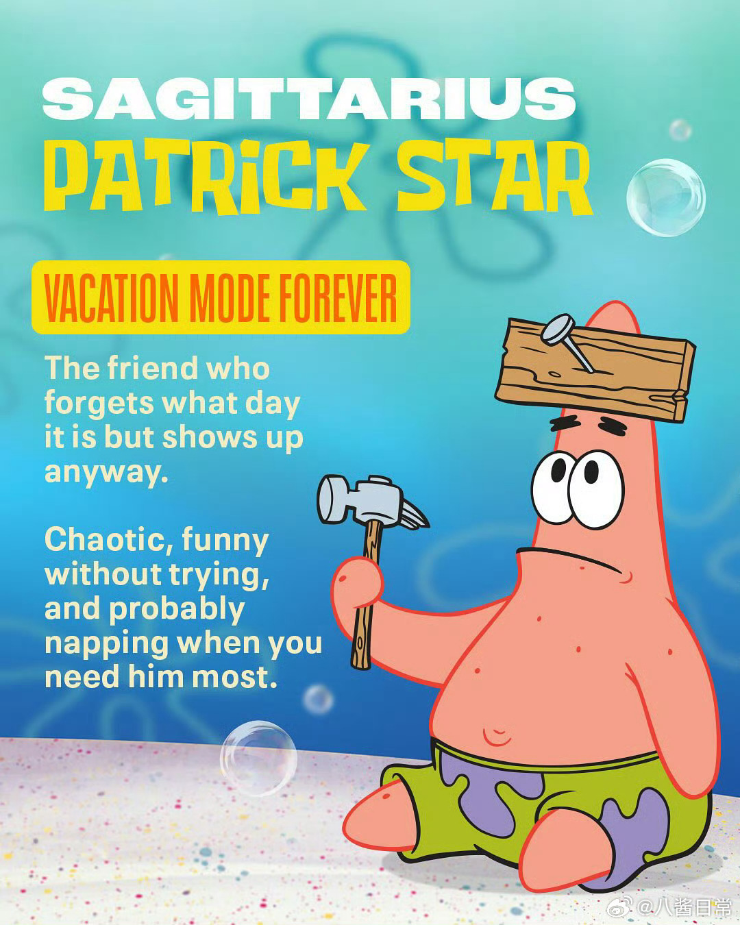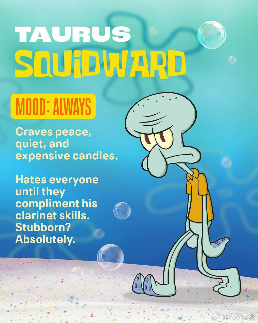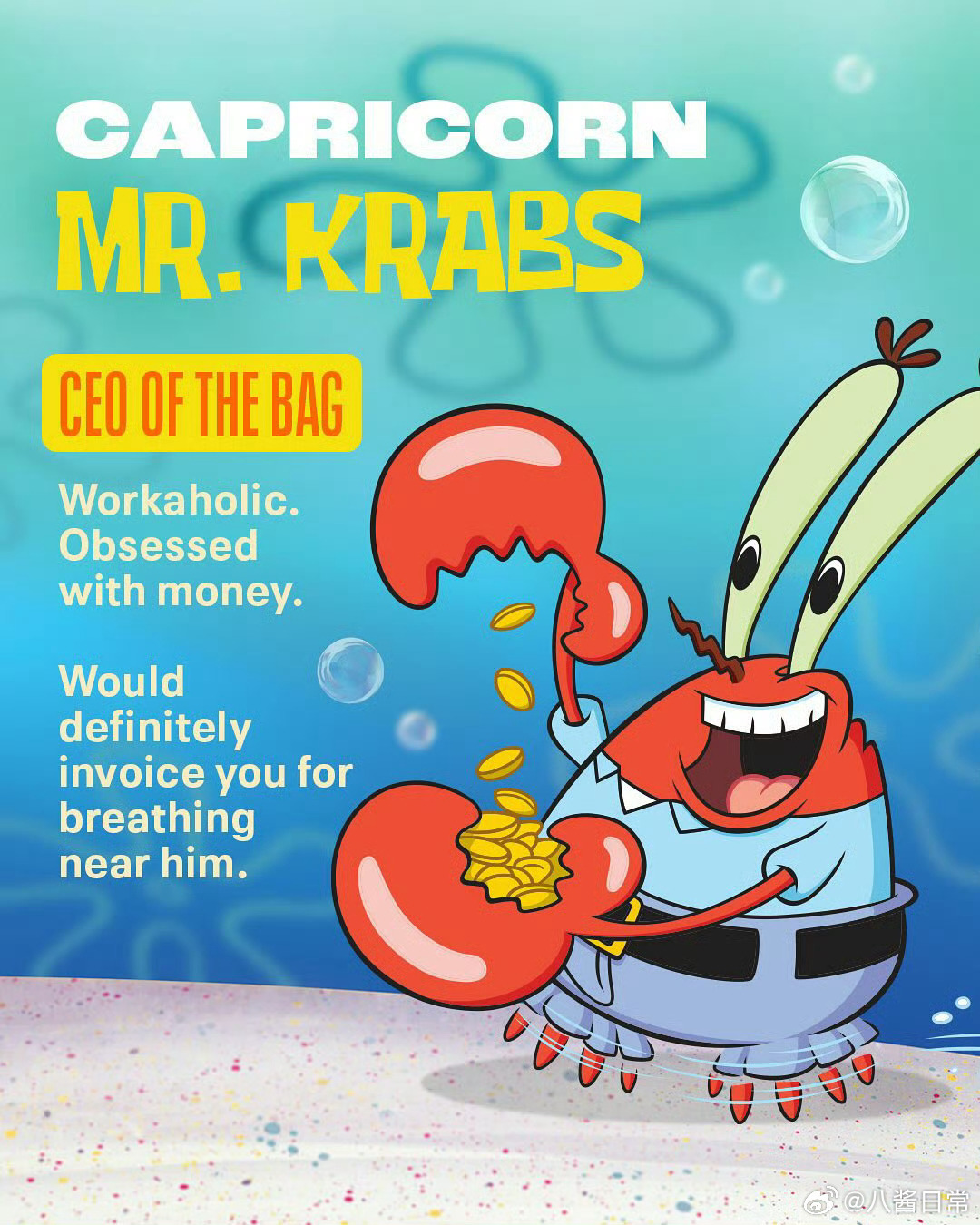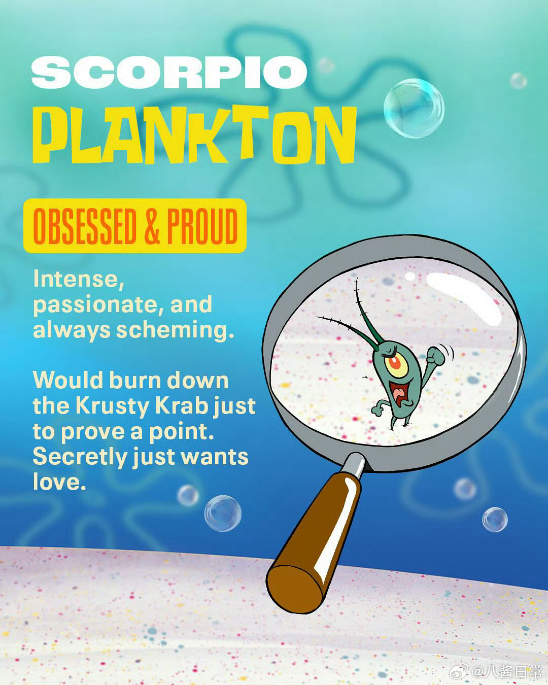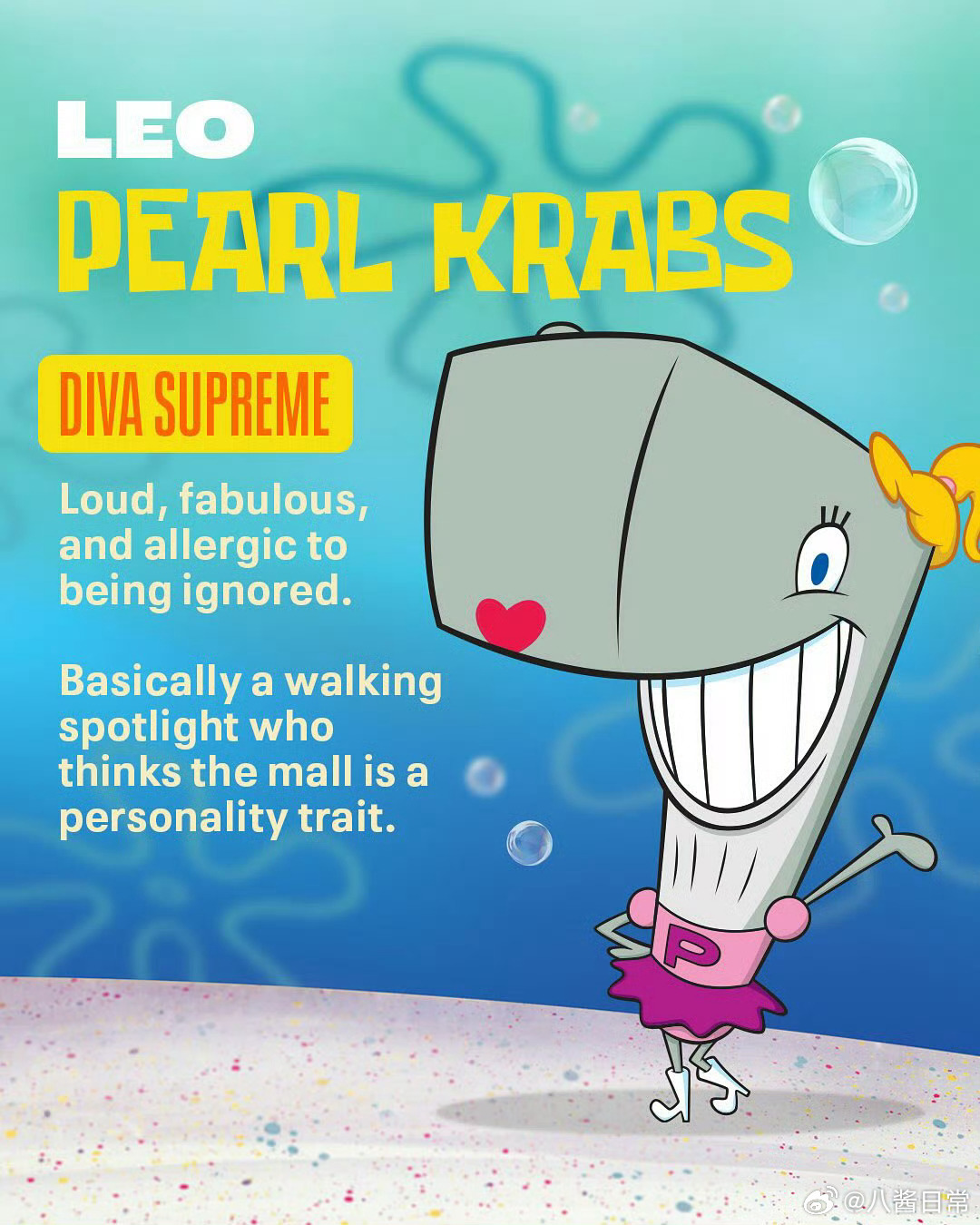 《海绵宝宝》人物星座公开,看看你跟谁是一个星座海绵宝宝(双子座)、派大星(射手座)、章鱼哥(金牛座) 珊迪(白羊座)、蟹老板(摩羯座)、痞老板(天蝎座)小蜗(双鱼座)、珍珍(狮子座)、泡芙老师(巨蟹座)、凯伦(处女座)、美人鱼战士(天秤座)、泡泡人(水瓶座)