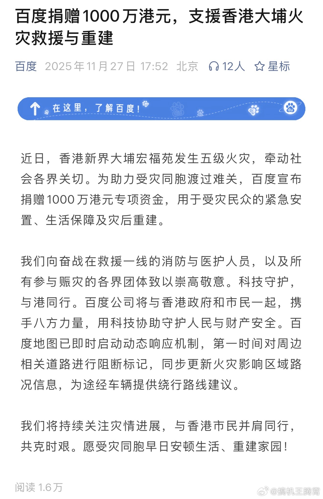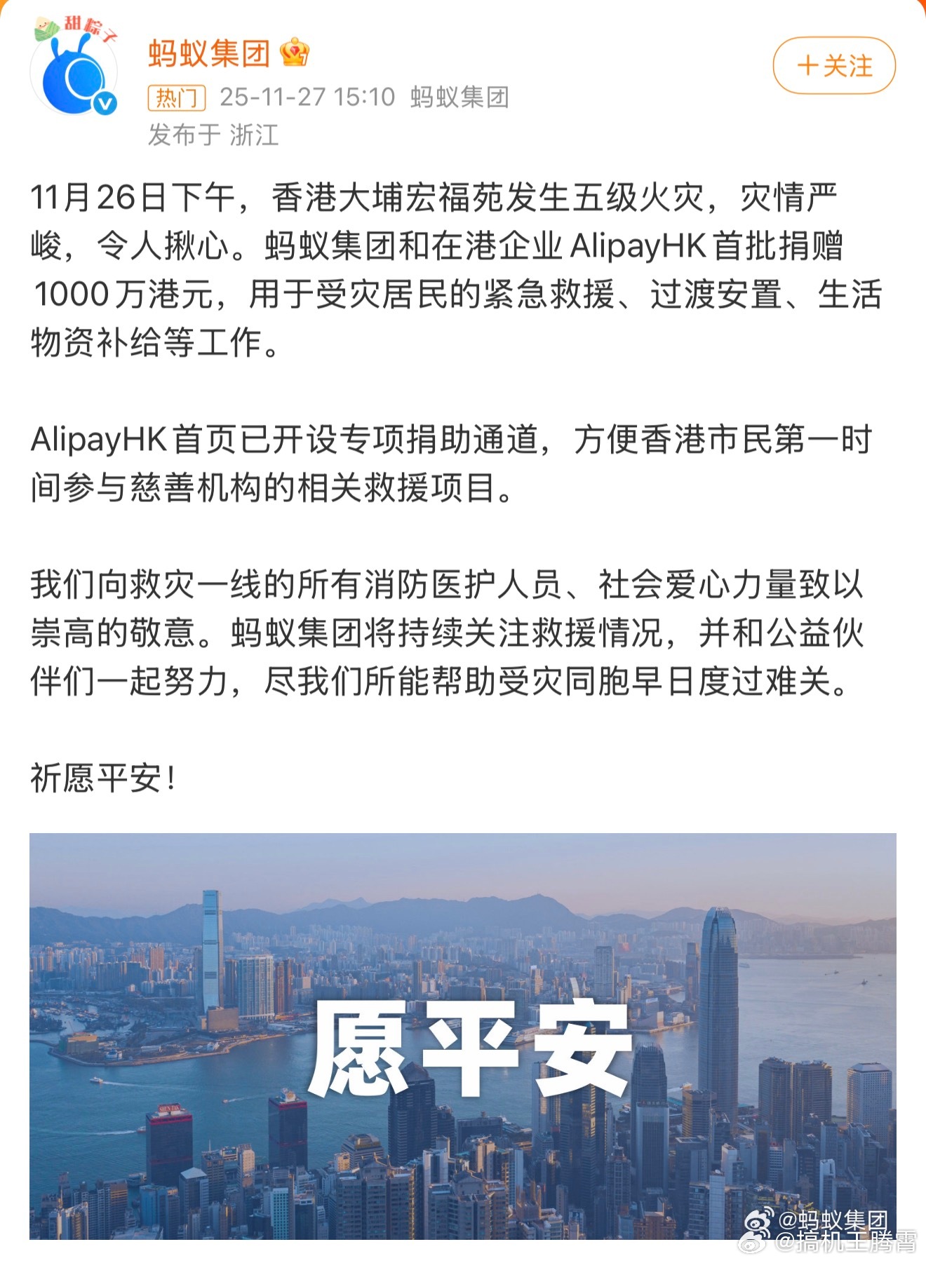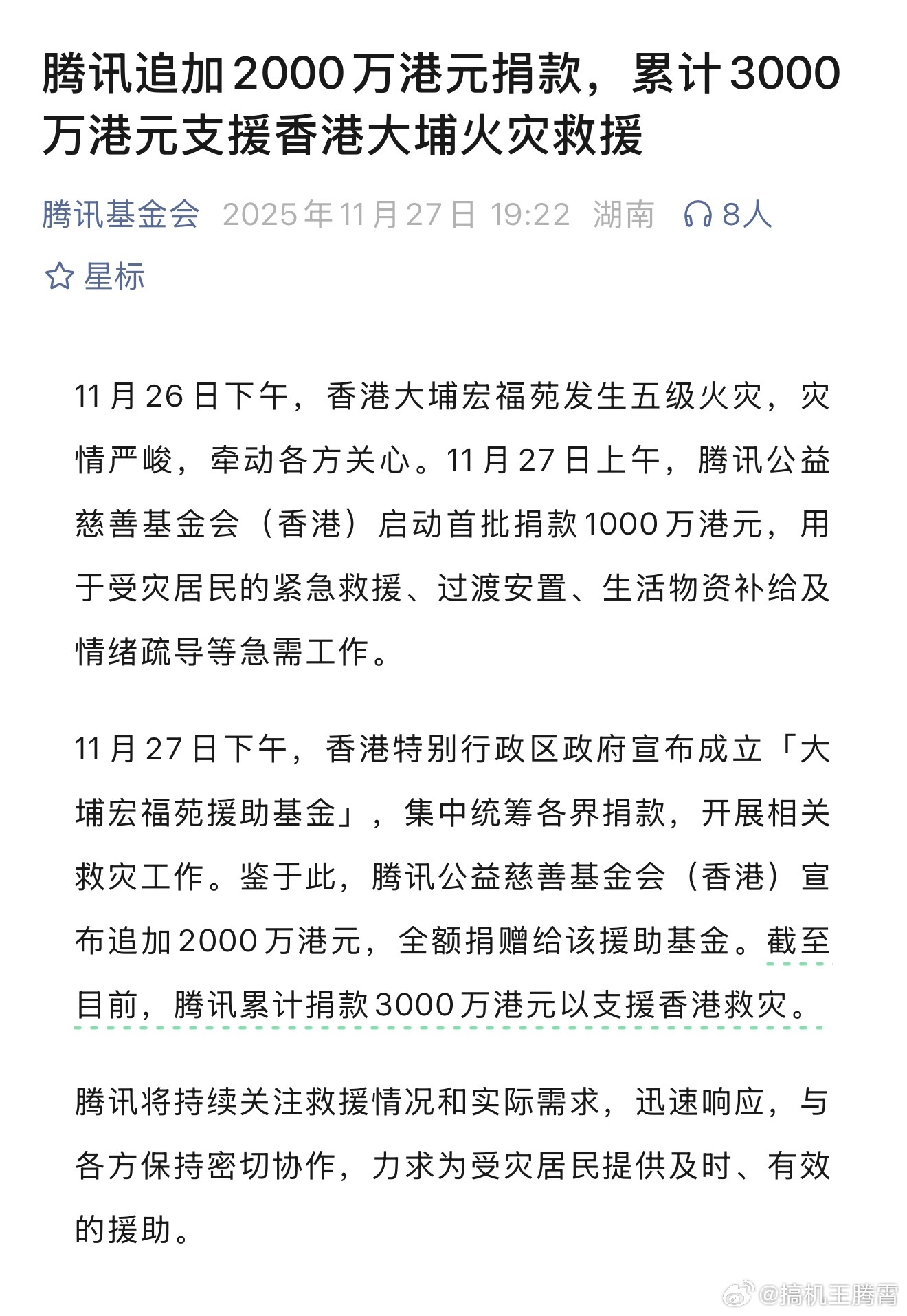 【截至目前各大企业驰援香港捐款不完全统计】阿里巴巴首批捐款2000万港元蚂蚁集团 + AlipayHK首批捐款1000万港元马云公益基金会捐款3000万港元腾讯基金会首批捐款1000万港元 + 追加2000万港元字节跳动捐款1000万港元唯品会捐款1000万港元百度捐款1000 万港元OPPO捐款1000万港元vivo捐款1000万港元网易捐款1000万港元比亚迪捐款1000万港元吉利控股集团 + 李书福公益基金会捐款1000万港元小鹏捐款500万港元赛力斯集团捐款500万港元滴滴公益首批捐款1000万港元…………真好,感谢这些捐款企业,这就是社会责任感的体现,相信有了这些企业做后盾,全国人民同心聚力,香港一定会平安度过难关