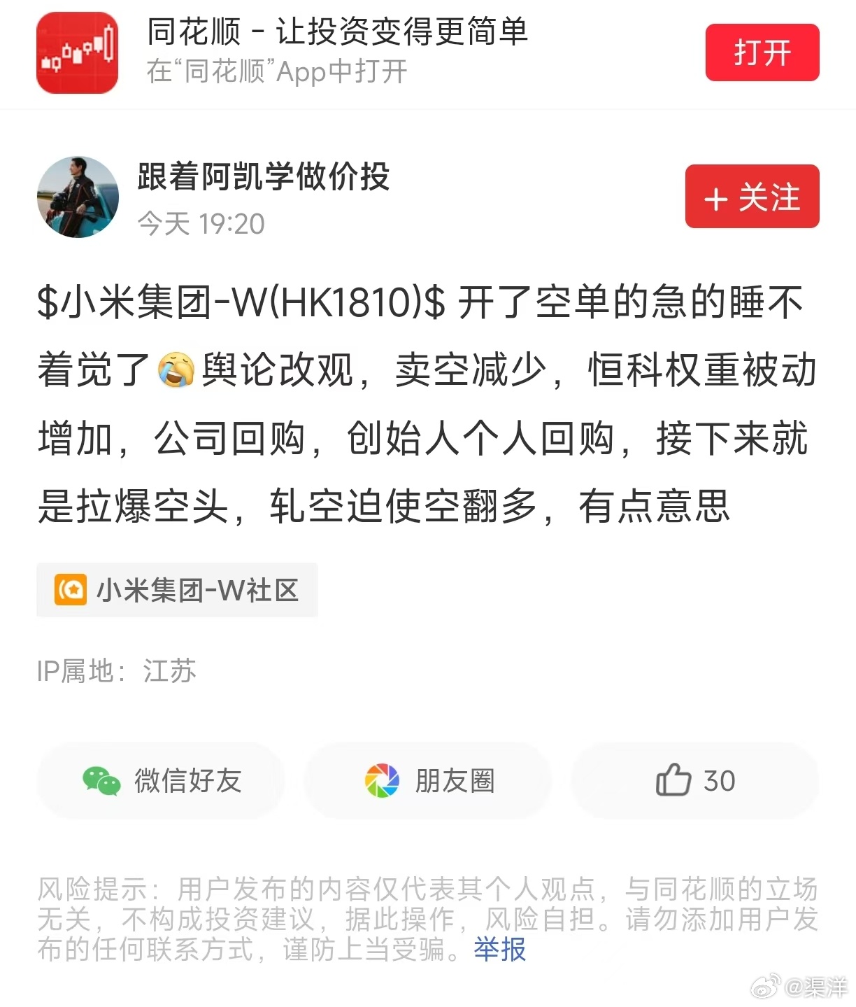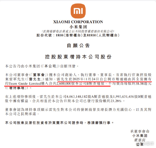真金白银直接砸懵唱空者!!雷总自掏超 1 亿港元,增持 260 万股,没有半句虚话,全是真金白银的表态。这波操作不是个例,此前 20、21 日,小米已连续两天斥资超 8 亿港元回购股票,“公司回购 + 创始人增持” 的组合拳,在车企中实属少见:不少同行仅创始人增持,却难见公司层面大手笔动作,小米这份诚意格外戳人。要知道,小米 Q3 业绩本就亮眼,股价却被低估,如今管理层果断出手,既是对空头的有力回应,更把雷总反复强调的 “行胜于言、以行践言” 落到实处。最近小米口碑也在反转,曾经的误解渐渐消散,而这超 9 亿港元的真金白银投入,比任何话语都更能证明对公司未来的坚定信心!