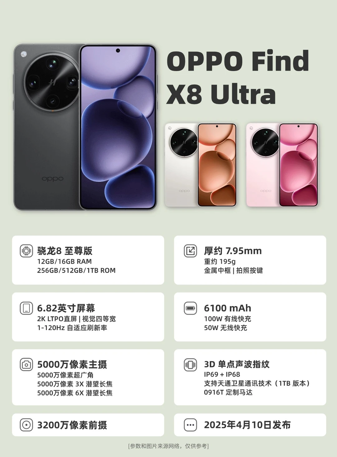 OPPO将在4月10号发布Find X8s、Find X8s+和Find X8 Ultra三台手机,其中X8s为“真正意义”上的小屏,X8 Ultra则是超大杯影像旗舰。