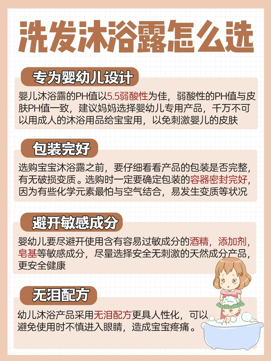 婴儿沐浴露的PH值以5.5弱酸性为佳,弱酸性的PH值与皮肤PH值一致,建议妈妈选择婴幼儿专用产品,不要把成人的沐浴用品给👶宝宝用,以免刺激婴儿的皮肤