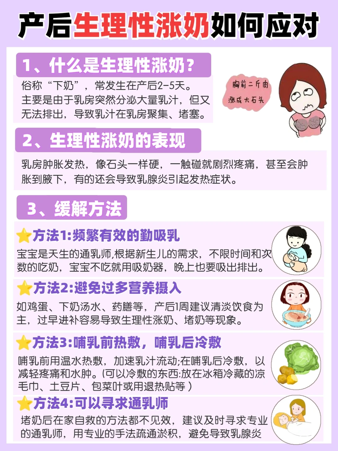 产后1-3天大部分妈妈都会面临生理性涨奶的问题,用对方法,自然顺利度过,图片上分享了哦.