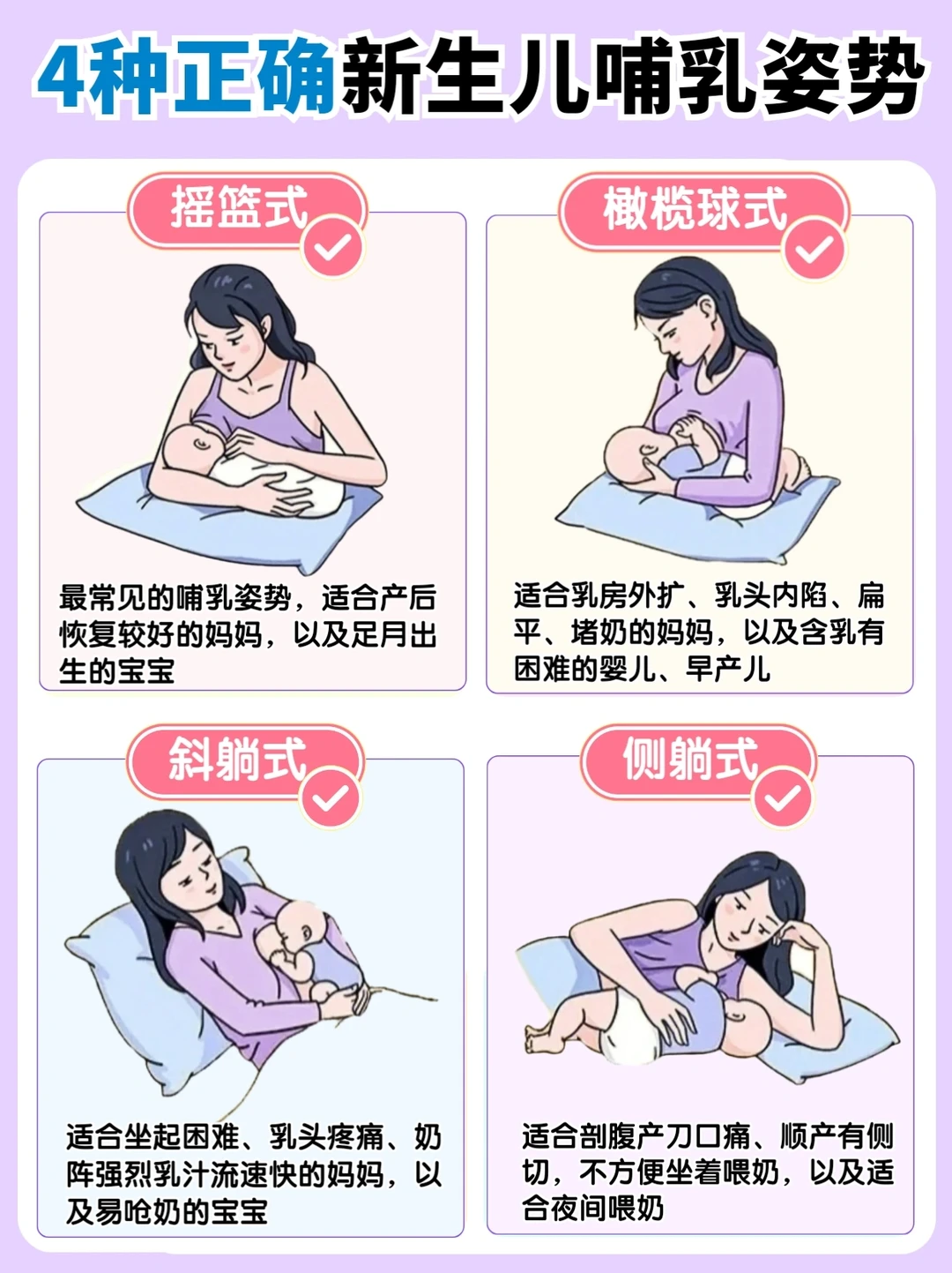一般常用的4种哺乳姿势是:橄榄球式、侧躺式、斜躺式、摇篮式。可以根据产后妈妈和宝宝的自身情况,选择方便舒适的姿势。
