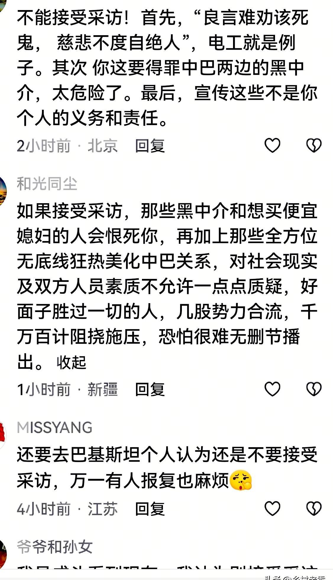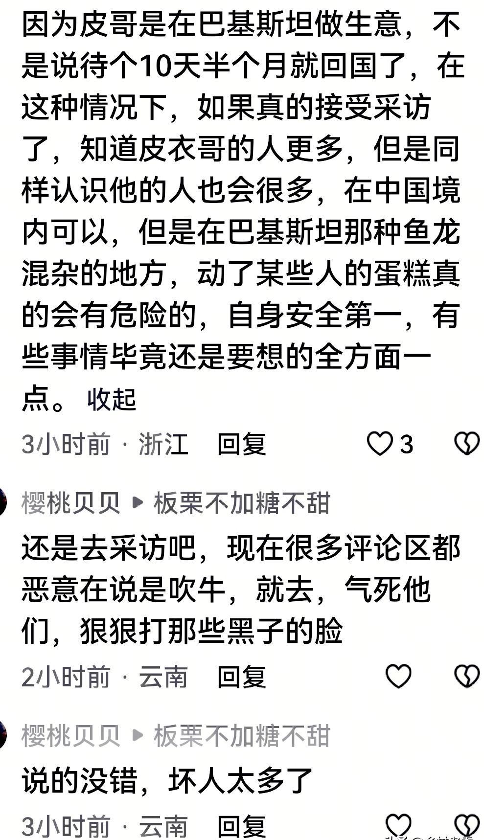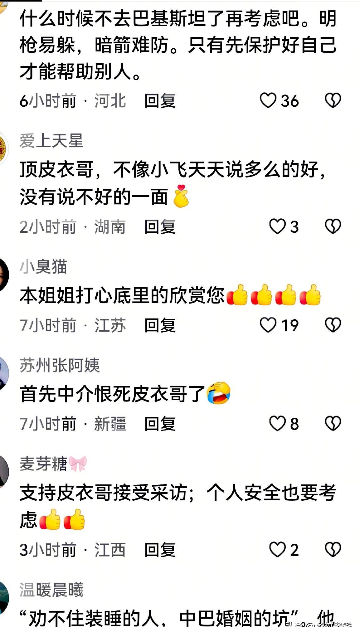 皮衣哥被凤凰网邀请聊中巴婚姻,他却犹豫了。 不是怕说话得罪人,是真怕出事。 这事儿没那么简单,背后藏着不少坑。 安全风险摆在明面上, 中介链条复杂,一不小心就踩雷。 他不是不敢说,是知道说了谁不爱听。 粉丝两极分化,有人支持他曝光骗局, 也有人觉得“你管得着吗? 你自己小心点”。 这年头,敢说实话的人不多了。 跨国婚姻不是爱情自由那么简单, 是现实和法律的双重考验。 正规渠道才是护身符,别让“浪漫”变成陷阱。 别光看热闹,这事真得掂量清楚。 不是每个人都能趟这趟浑水。 皮衣哥要是真上镜,可能得先找个安全出口。