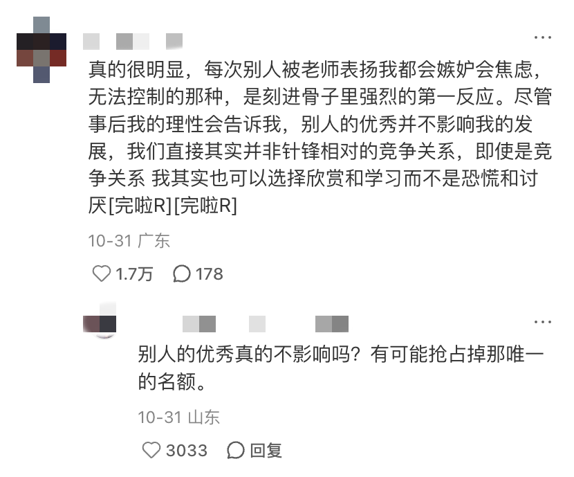 有人无法忍受别人受到夸奖,甚至别人被老师表扬都会产生无法控制的嫉妒和焦虑。尽管理智一直告诉自己,别人的优秀不等于自己的失败。即便不是针锋相对的竞争关系,只要底层代码一发力,就控制不住开始恐慌和妒忌。