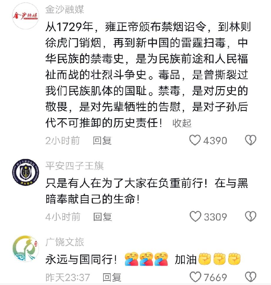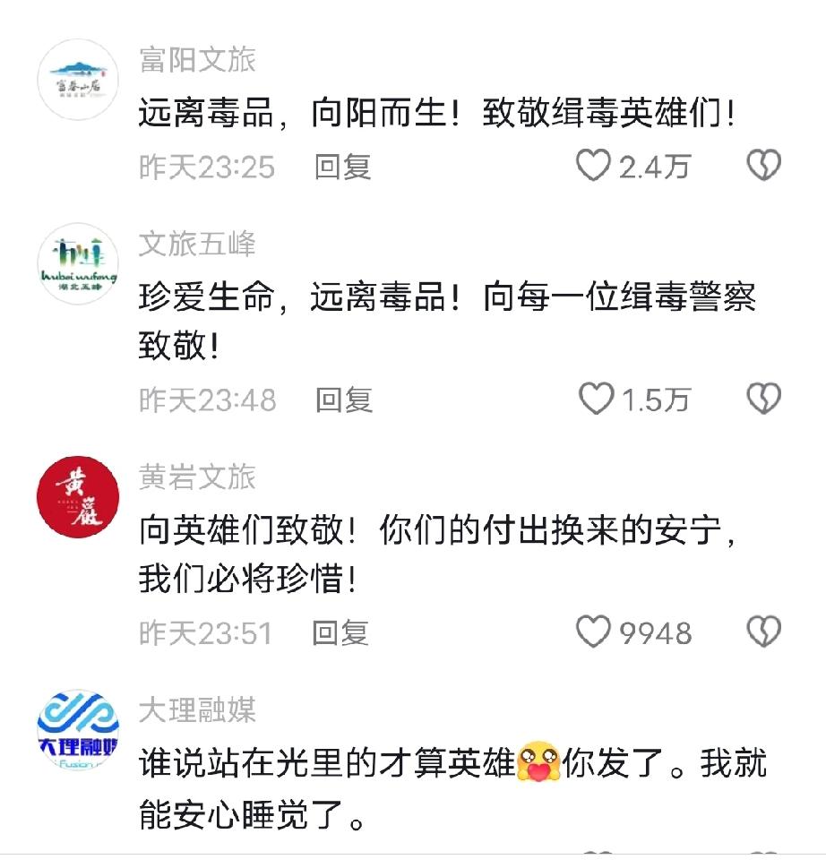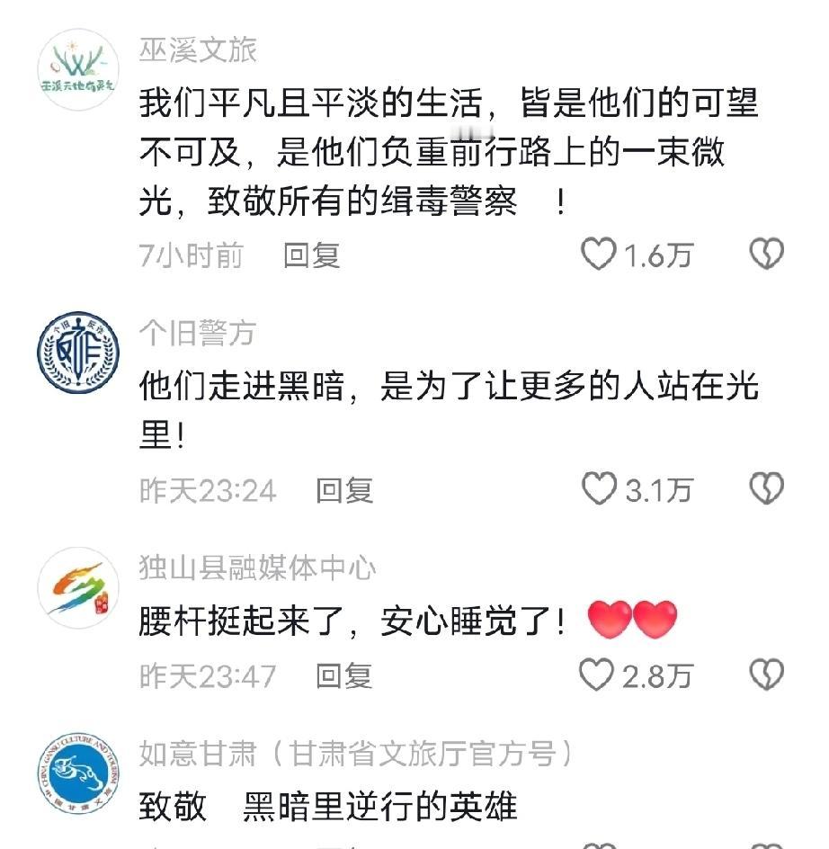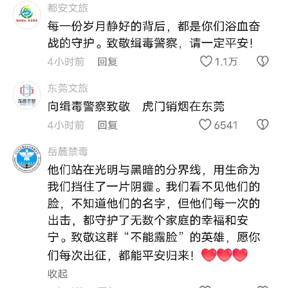 泪目了!谁懂啊!云南日报发的禁毒视频被人民日报转发了! 各地文旅纷纷在评论区留言: “可以安心睡觉了!” “对待毒贩:零容忍,零同情,零原谅!” “寸步不让,谁说站在光里的才是英雄,中国禁毒加油!” “我们平凡且平淡的生活,皆是他们可望不可及的,是他们负重路上的一束微光,致敬所有的缉毒警察!” “当所有的人都向着安全的方向奔跑时,他们却选择逆流而上,冲向危险的深渊,刀光剑影生死一线,他们无所畏惧,只为斩断毒品的魔爪,他们不是无所畏惧,只是选择了勇敢,向最坚定的逆行者致敬!” …… 说实话,看完视频只让我觉得他的伟大,看完评论区我眼泪止不住了。 同样都是血肉之躯,同样都流着中国人的血,他们直到付出生命后我们才能从黑白照片上看到。 其实不止各大文旅,全国人民都会记住保卫我们这些“不能露脸”的英雄们! 在此,向每一位奋战在一线的缉毒警察致敬,请一定平安!