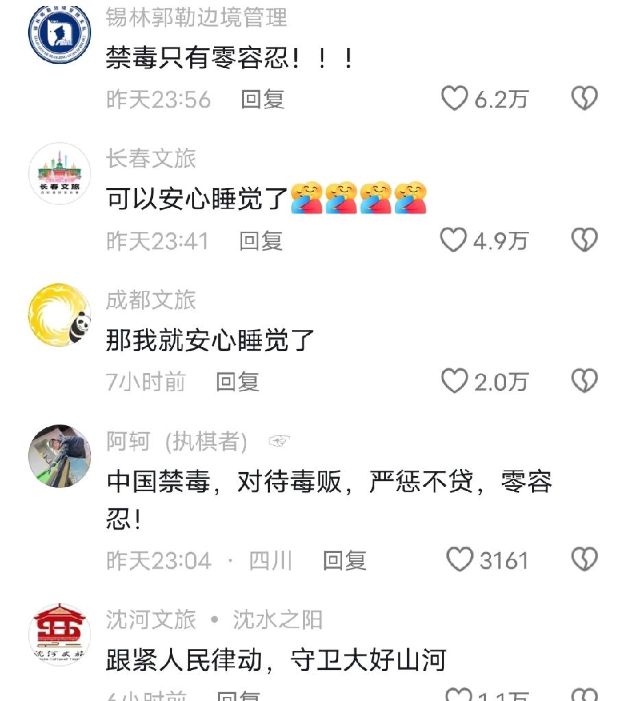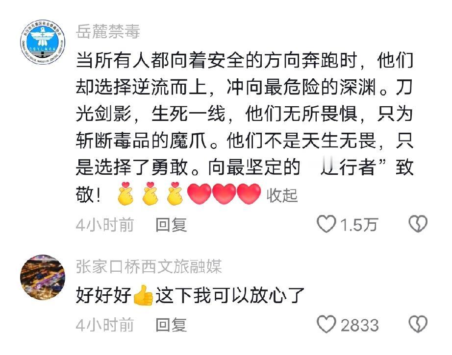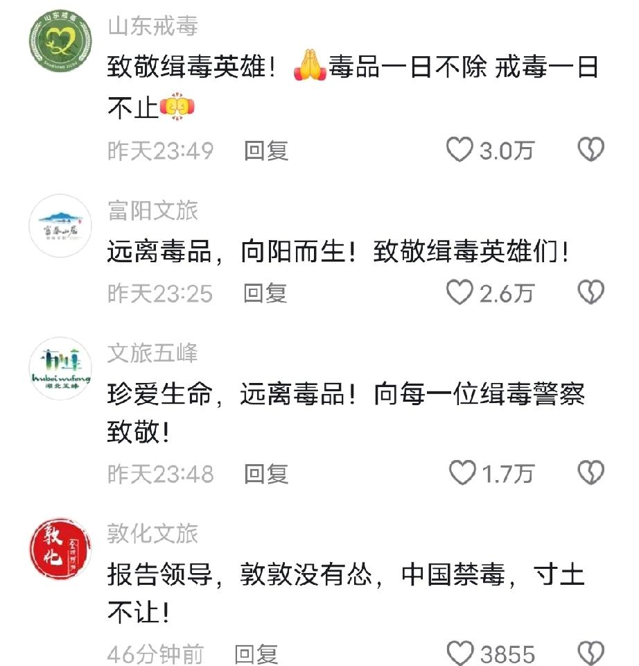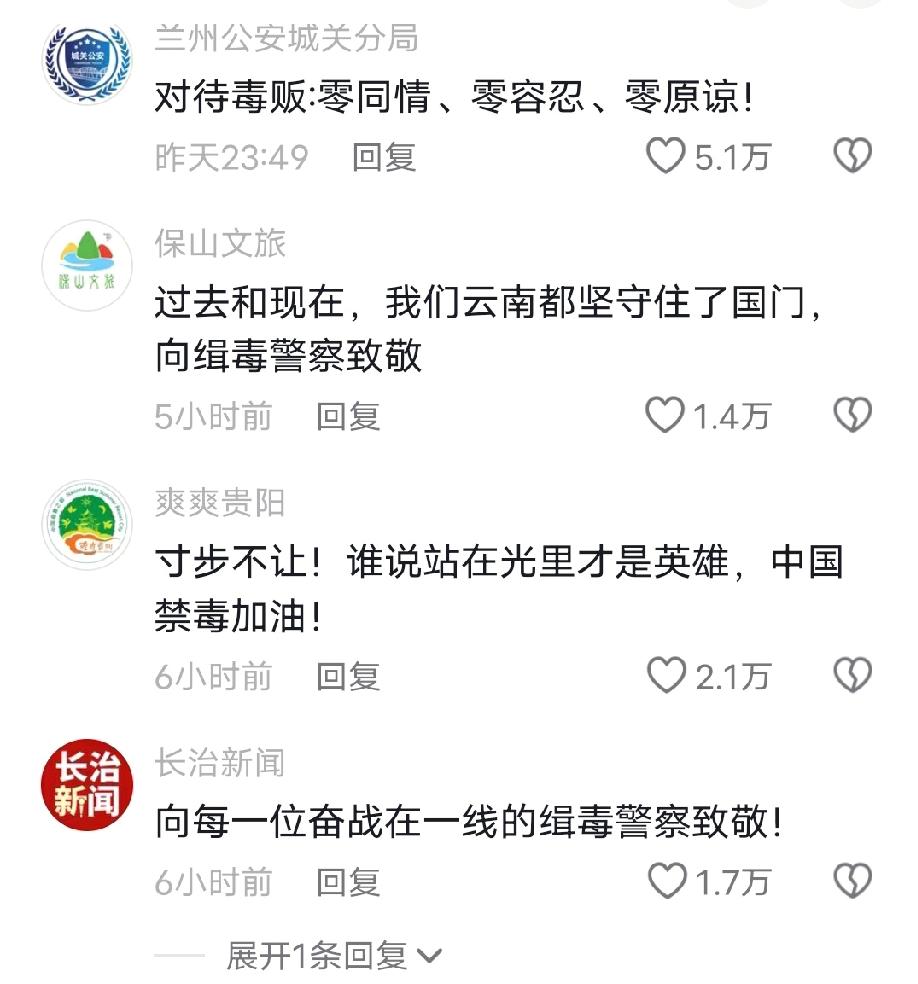 泪目了!谁懂啊!云南日报发的禁毒视频被人民日报转发了! 各地文旅纷纷在评论区留言: “可以安心睡觉了!” “对待毒贩:零容忍,零同情,零原谅!” “寸步不让,谁说站在光里的才是英雄,中国禁毒加油!” “我们平凡且平淡的生活,皆是他们可望不可及的,是他们负重路上的一束微光,致敬所有的缉毒警察!” “当所有的人都向着安全的方向奔跑时,他们却选择逆流而上,冲向危险的深渊,刀光剑影生死一线,他们无所畏惧,只为斩断毒品的魔爪,他们不是无所畏惧,只是选择了勇敢,向最坚定的逆行者致敬!” …… 说实话,看完视频只让我觉得他的伟大,看完评论区我眼泪止不住了。 同样都是血肉之躯,同样都流着中国人的血,他们直到付出生命后我们才能从黑白照片上看到。 其实不止各大文旅,全国人民都会记住保卫我们这些“不能露脸”的英雄们! 在此,向每一位奋战在一线的缉毒警察致敬,请一定平安!