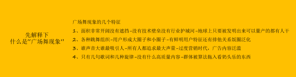下面我解释一下什么是营销“广场舞现象”,广场舞现象其实是对黑暗丛林法则的比较世俗化的解释,广场舞面积非常开阔,就像现在整个互联网商业世界是完全开放状态,没有人有护城河,没有人有壁垒。