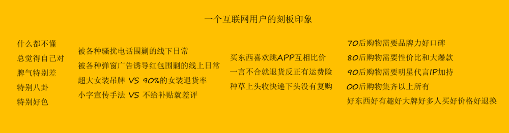 我再总结一下现在整个互联网用户的刻板印象,第一是什么都不懂但总觉得自己对,脾气特别差,特别八卦还特别好色,现在万物皆可“擦”,开个烤肉店也可以“擦”,卖什么东西也要“擦”一下;第二,被各种骚扰电话围剿的线下日常与被各种弹窗广告诱导红包围剿的线上日常;第三,超大女装吊牌vs90%女装退货率;第四,小字宣传手法我当年做传统广告就在用,现在只不过玩得更多了,还有不给补贴就差评,现在网上羊毛党特别多,做品牌一定要小心应对机制。