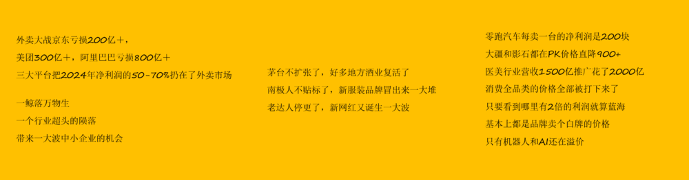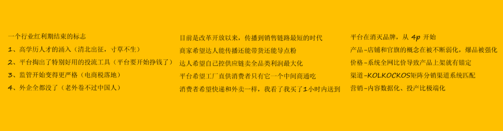 我还总结了一个行业红利结束的标志,第一个是高学历人才的涌入,我常说一句话叫清北出征、寸草不生,现在直播电商还是有一点红利,但它要求的学历真的很低,公司去招人基本是职高学历。有一天我们看到一个从澳洲回来的硕士生,他的工资从2万起步,到后来被各家公司加码加到了4万5,就是因为他在澳洲学的传播学,且愿意去做直播和达人孵化,而且他的表达、思路都很清楚。但是你们想象一下,如果未来的网红全都是清北毕业的,那这行业没法做了。