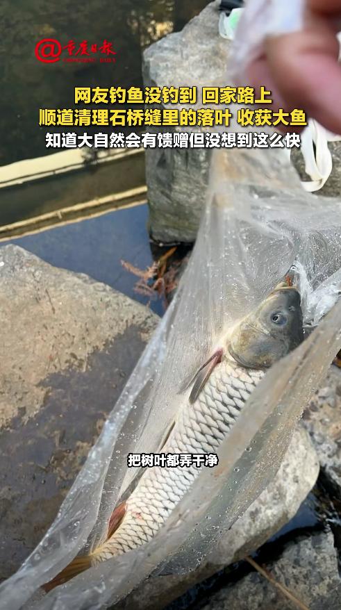 “这就是命!”云南,一女子去河边钓鱼,结果一条都没钓到,正准备空军回家时,看到石桥缝被堵住,就想着顺手清理一下,没成想却意外发现一条大鱼,直接喜滋滋的带回家了。鱼:活了这么久第一次遇上没有职业道德的钓友。 据重庆日报11月27日报道,这位大姐平时就爱钓个鱼,那天看着天气不错,就收拾好家伙事儿去了常去的小河边。 选位置、打窝、调漂、挂饵,一套动作行云流水,就等着鱼儿上钩了,可怪就怪在这儿,一下午过去,那浮漂就像是被焊在了水面上,别说大鱼了,连个小杂鱼过来捣乱的都没有。 眼看着太阳慢慢下山,大姐心里那个郁闷劲儿就别提了,心想今天算是“空军”了,啥也没捞着,收拾东西准备回家,她走到一座用石头搭起来的小桥上。 这桥平时人来人往的,她也没太在意,可今天她一眼就瞅见不对劲,上游飘下来的枯枝烂叶,把桥洞给堵得严严实实,河水都漫上桥面了。 大姐心想,这堵着也不是个事儿啊,万一下大雨水过不去,把桥冲了咋办?反正闲着也是闲着,干脆帮着疏通一下吧。 说干就干,她也没嫌脏,找了根粗点的树枝,就开始在桥洞里捅捅咕咕,把那些堵塞的垃圾一点点往外扒拉。 清理了好一会儿,水流渐渐顺畅了,就在她准备直起身子歇会儿的时候,眼神无意间往一个石头缝里一瞟,嘿!这一看可把她给乐坏了。 只见一个黑乎乎的大东西卡在石头缝里,仔细一瞅,竟然是一条肥硕的大鱼!那条鱼也不知道是被水流冲进来的,还是自己游进去被卡住了,反正是一动不动地挤在那儿。 这可真是天上掉馅饼的好事,钓鱼没钓着,回家路上捡了一条!大姐赶紧扔了手里的树枝,伸手就去抓。 可那鱼滑溜溜的,加上石头缝又窄,试了好几次都没弄出来,最后她急中生智,又找来那根棍子,连捅带撬,费了九牛二虎之力,才终于把这条大鱼给“解救”了出来。 拎在手里沉甸甸的,少说也得有几斤重。刚才钓不着鱼的郁闷心情瞬间一扫而空,取而代之的是满满的惊喜和开心。 她自己都乐了,感叹说:“虽然一条鱼都没钓上来,但咱清理了河道,这河道就给了我一个大大的回馈!” 这事儿发到网上,一下子就热闹起来了,好多网友都觉得这事儿特别有意思,有个网友开玩笑说:“这鱼不算数!不是钓上来的,得放回去,钓鱼人要有自己的原则和素养!” 当然了,这都是大家善意的调侃,更多的人是被大姐这个无心之举给打动了。 有人说:“这哪是运气好,这就是做了好事得到的回报,比自己辛辛苦苦钓上来的鱼吃着更香!” 还有个钓友分享自己的经历,说他上次在河边钓鱼,顺手把别人扔的一袋垃圾给捡走了,结果第二天就在同一个地方钓到了一条五斤重的大草鱼。 他说从那以后,他就信了,你对大自然好,大自然真的会给你惊喜,其实仔细想想,这事儿真的不只是运气那么简单。 大姐一开始钓不着鱼,心情肯定不好,换做别人,可能早就气冲冲地回家了,哪还有心思去管桥洞堵不堵?可她没有,她虽然郁闷,但看到问题还是愿意顺手解决。 正是这份不计较、不麻烦的善意,才让她有机会发现那条被困的鱼,如果她当时嫌脏怕累,绕道走了,那这条鱼可能就永远卡在石头缝里,她也错过了这份“大自然的馈赠”。 我们生活中,不也经常遇到这样的事吗?有时候你削尖了脑袋想去达成一个目标,拼了命地努力,结果却总是差那么一点意思。 反倒是一些不经意间做的小事,一些没想着要回报的付出,却在某个意想不到的时刻,给了你一个大大的惊喜。 这就像种地一样,你只管耕耘、浇水、施肥,至于什么时候结果,结多大的果,有时候真的不是你能完全控制的,这位大姐的行为,其实也体现了一种对自然的敬畏。 现在很多钓鱼的地方,岸边都是垃圾成堆,塑料袋、饵料袋扔得到处都是,而真正热爱自然、懂得感恩的人,会像大姐一样,顺手维护身边的环境。 他们知道,你爱护这条河,这条河才会用清澈的河水和肥美的鱼儿来回报你,所以说,这哪里是什么“天上掉馅饼”,这分明就是“好心有好报”最生动的写照。 它告诉我们一个最朴素的道理:做人做事,但行好事,莫问前程,你只管做一个善良、勤快的人,那些你应得的好运和福气,说不定就在哪个拐角,等着给你一个惊喜呢! 信源:重庆日报2025-11-27——网友钓鱼没钓到 回家路上 顺道清理石桥缝里的落叶 收获大鱼 知道大自然会有馈赠但没想到这么快