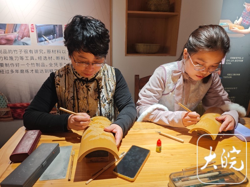 乔瑜(左)正在创作竹刻作品
