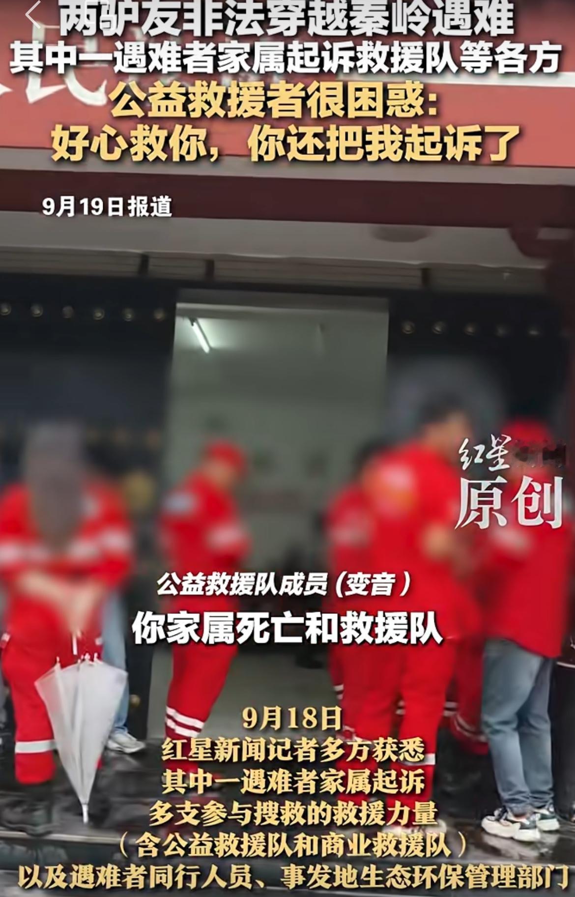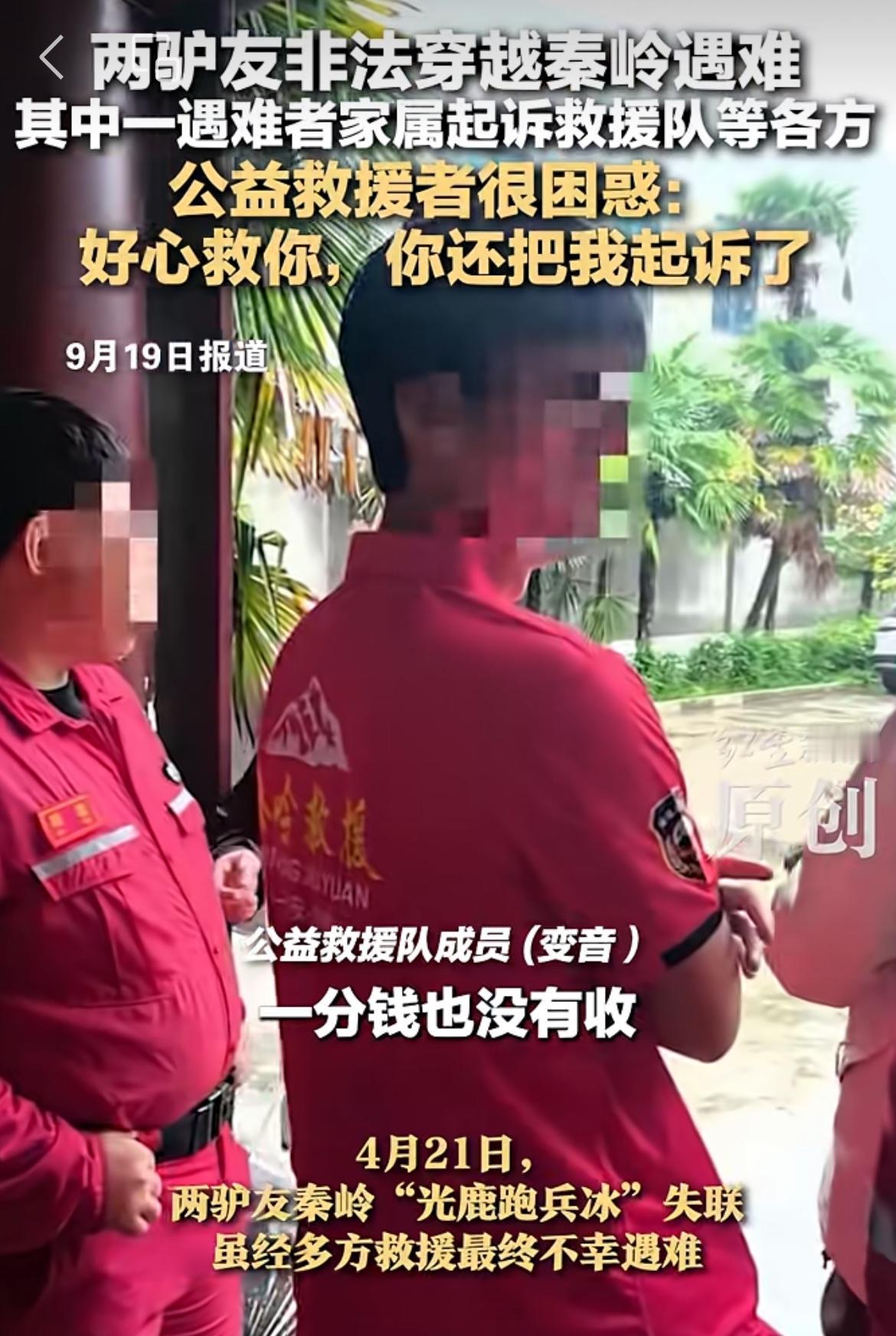2名驴友秦岭失踪,家属起诉救援队和另外两名同伴。事情发生于今年4月,4名旅游在驴友群结伴去穿越秦岭光鹿跑兵冰路线,在上山途中突然遭遇暴风雪天气,4人走散,其中两人艰难逃生,另外两人失联。家属邀请了多支搜救队上山寻找,最后找到两人遗体。事后家属把他们都给告了,哎,这种高风险项目,都是成年人,风险自担啊,人死了要赖是个什么道理。驴友赔偿