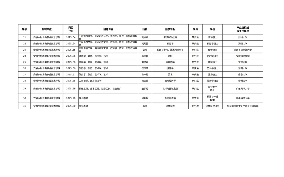 31人!2025年度安徽水利水电职业技术学院公开招聘工作人员拟聘用人员名单(第一批)公示