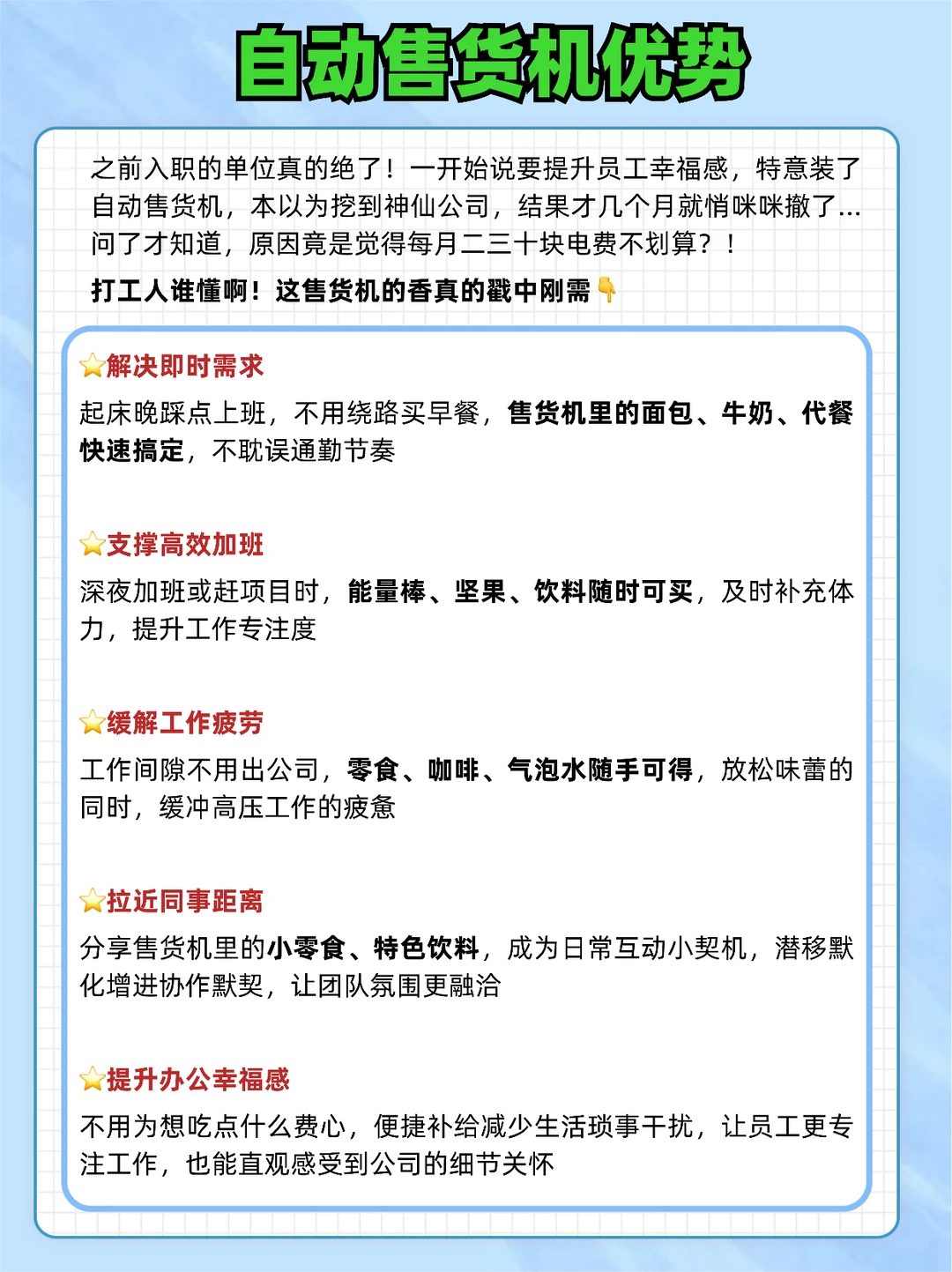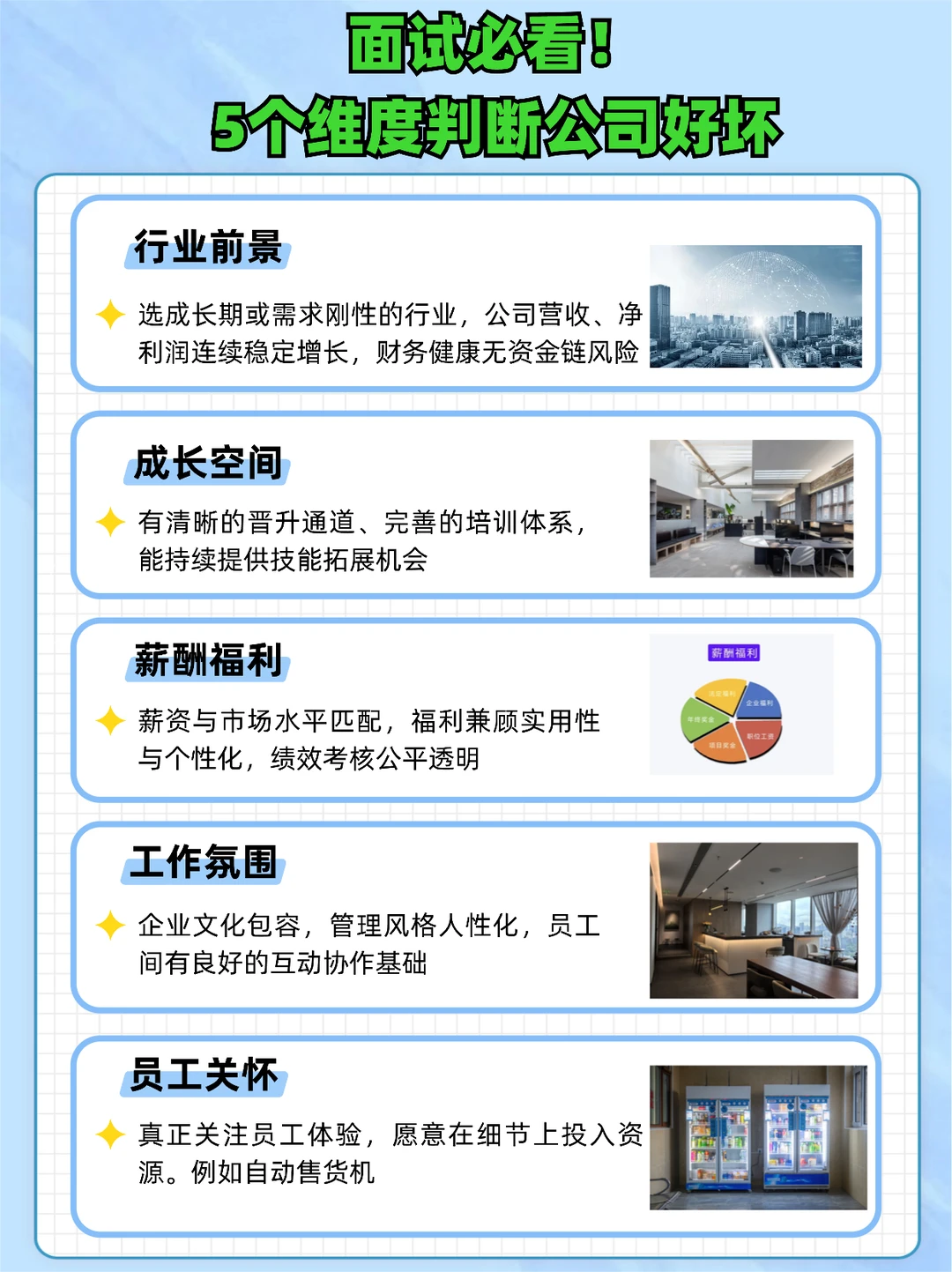 很多宝子[满月R]换工作时,满脑子都是 “这份工作能不能要我” “薪资够不够吸引人”,却很少反问自己:这家公司真的值得我加入吗[萌萌哒R]?公司真的靠谱吗? 我换了[三R] 份工作,踩了很多坑 —— 行业下坡没前景、老板画饼不兑现、连员工基本需求都敷衍。我入职后才发现不对劲,离职成本又高,真的追悔莫及😭 其实工作是双向选择,宝子考察公司的眼光👀,直接决定未来工作的幸福感! 💡5个细节帮你筛掉烂公司 1️⃣ 行业前景:选成长期或需求刚性的行业,公司营收、净利润连续稳定增长,财务健康无资金链风险 2️⃣ 成长空间:有清晰的晋升通道、完善的培训体系,能持续提供技能拓展机会 3️⃣ 薪酬福利:薪资与市场水平匹配,福利兼顾实用性与个性化,绩效考核公平透明 4️⃣ 工作氛围:企业文化包容,管理风格人性化,员工间有良好的互动协作基础 5️⃣ 员工关怀:真正关注员工体验,愿意在细节上投入资源,例如自动售货机 其实员工关怀,才见公司底色!我见过抠门天花板 —— 公司搞员工福利项目,装了台自动售货机,实则是想靠机器创收🙄摆了几个月,因为公司人少,零食柜收益不够付几十块电费,行政二话不说就搬走了,真的气人! 完全不管它给员工带来的好处。 ✅ 早餐方便:踩点上班,方便拿面包牛奶,不耽误打卡 ✅ 安心加班:深夜赶项目,能量棒、坚果随时补体力 ✅ 下午福利:零食咖啡随手来,放松大脑效率更高 ✅ 拉近感情:一句 “帮你带瓶可乐?” 轻松破冰 ✅ 幸福感拉满:连饿了渴了都考虑到,才是真用心! 关键无人售货机,还不用公司花钱买!就为了省二十来块电费说撤就撤,可见对员工有多抠。连这点钱都舍不得,你还指望在这升职加薪?不被压榨就不错了! 好公司从来都是把员工关怀做细做实的。选工作时,注意识别老板和HR的饼,多观察公司小细节!祝大家都能避开烂公司,找到钱多事少氛围好的神仙工作✨