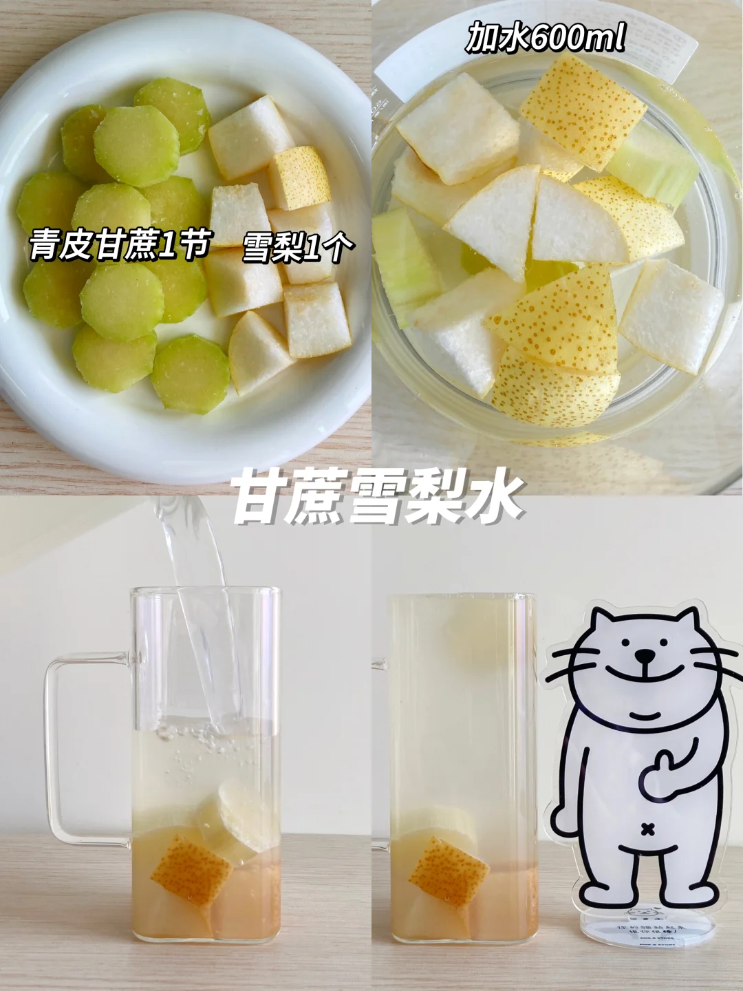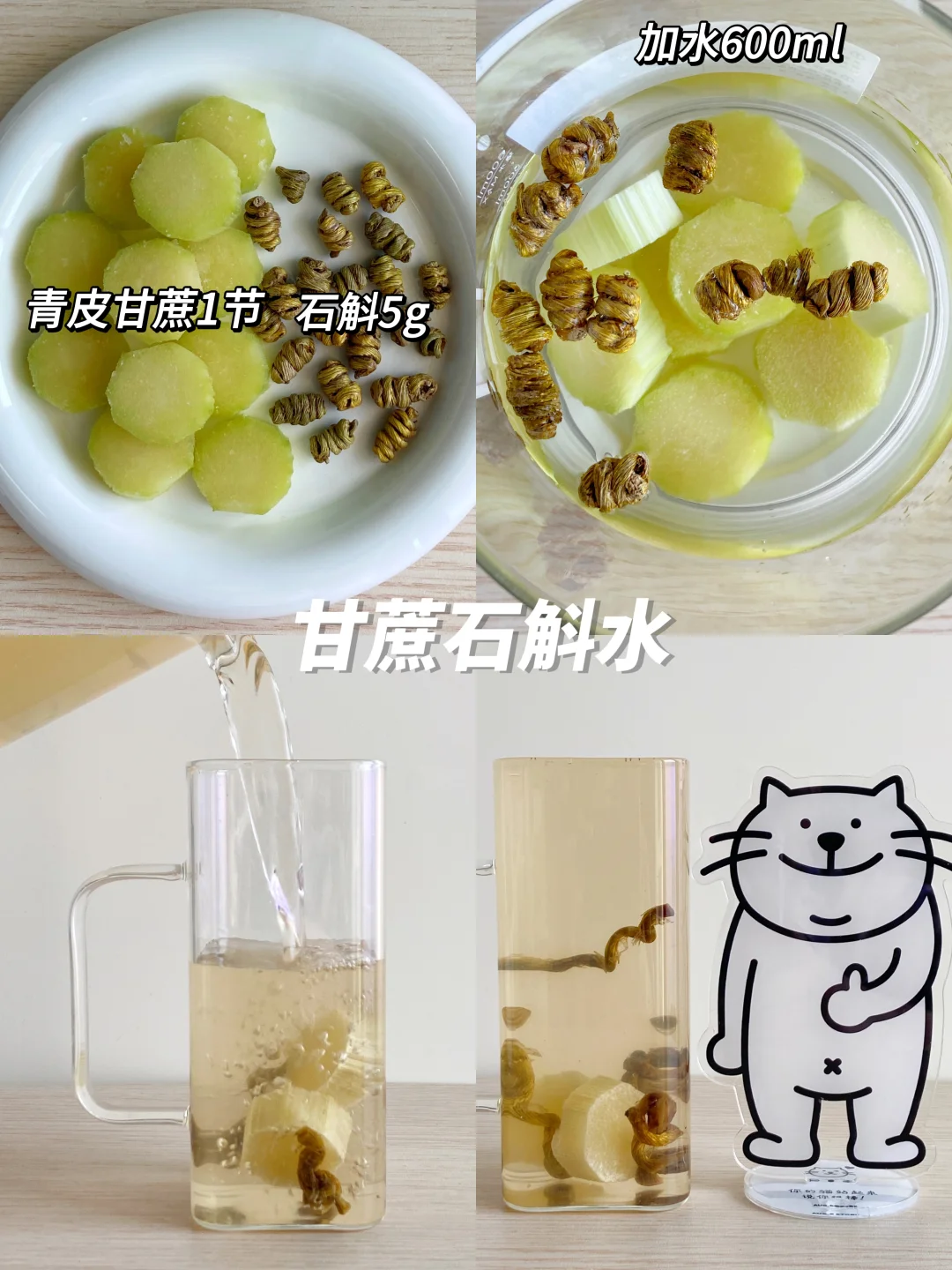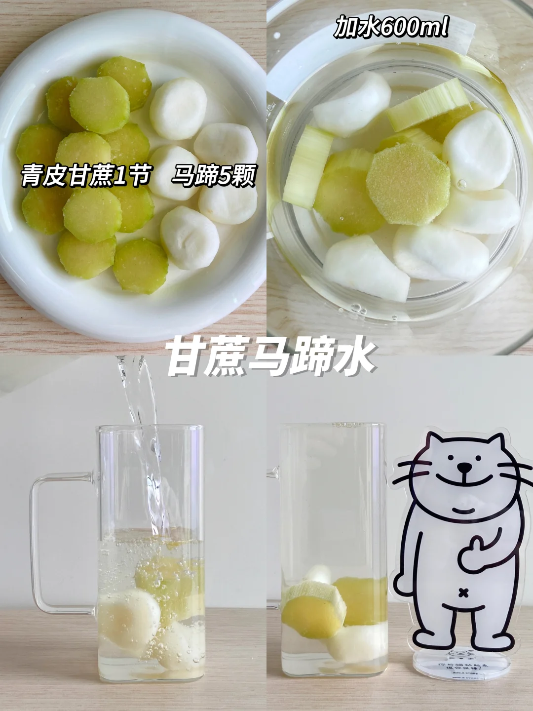 又到了喝甘蔗水的季节,跟倪大师学的养生甘蔗水,清甜滋润真的太舒服~ 1⃣️青皮甘蔗1节+陈皮 3g+水 600ml 2⃣️青皮甘蔗1节+石斛5g+水600m 3⃣️青皮甘蔗1节+红茶 2g+水 600ml 4⃣️青皮甘蔗1节+金桔3个+水 600ml 5⃣️青皮甘蔗1节+马蹄5颗+水 600ml 6⃣️青皮甘蔗1节+雪梨1个+水 600ml - 做法:以上养生壶煮15分钟左右,每款效果都不一样哦!