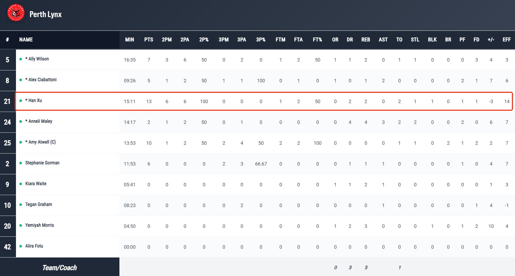 WNBL:韩旭半场百分百命中率砍13分,珀斯山猫半场领先7分