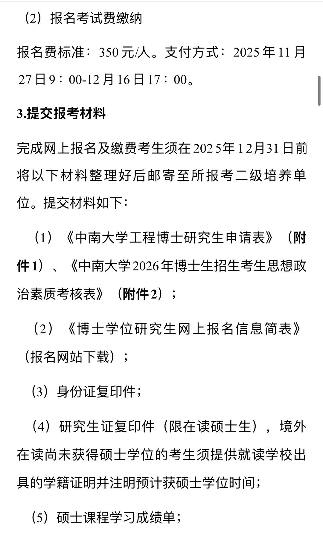 0854电子信息;0855机械;0856材料与化工;0857资源与环境;0858能源动力;0860生物与医药;0859土木水利;0861交通运输。三、招生计划2026年我校拟安排工程博士专业学位计划450个,最终招生人数以国家下达的2026年博士生招生计划,根据实际情况进行调整为准。各二级单位招生专业领域、招生计划、指导教师以及二级单位详细联系方式见公布的《中南大学2026年博士研究生招生简章》。