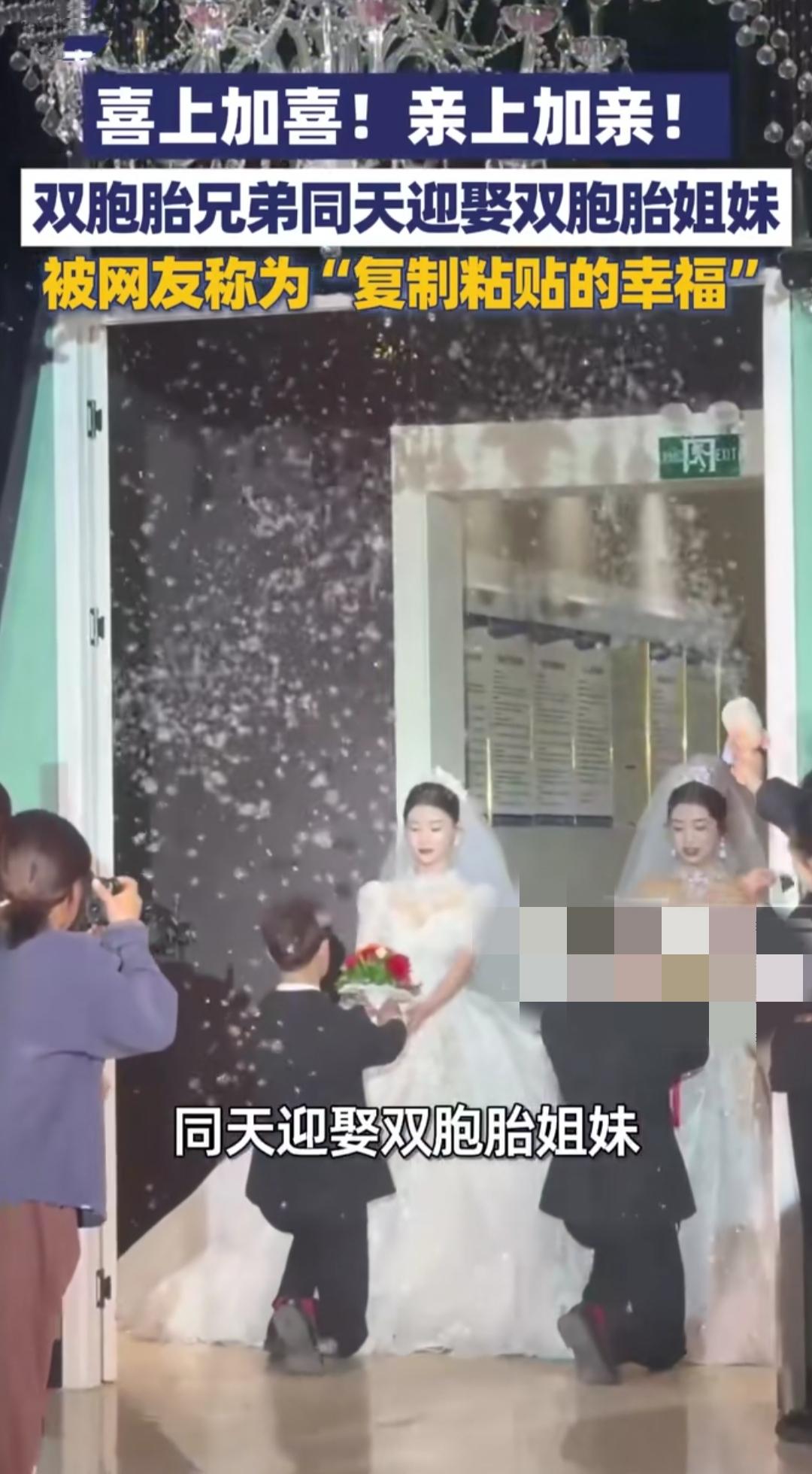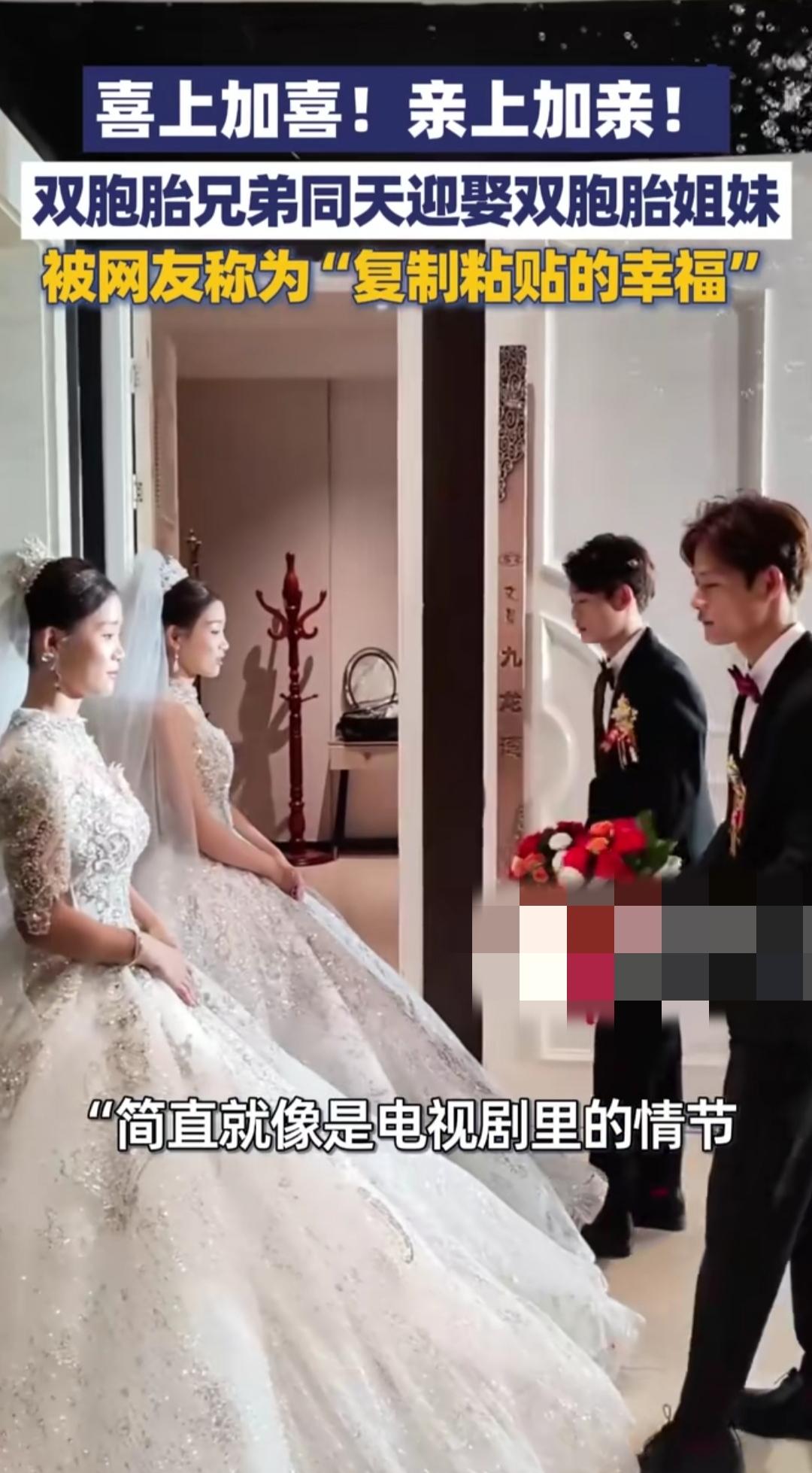 河南商丘这场婚礼太绝了!两对新人站在一起,台下宾客全看傻了——不是双胞胎办婚礼,是双胞胎娶了双胞胎,四人间谍战似的场面,让随礼的亲戚都犯了难。 新郎是同卵双胞胎兄弟,新娘也是一对双胞胎姐妹,四人从小认识,慢慢走到一起,还敲定在同一天举办联合婚礼。婚礼上交换戒指时,伴郎伴娘都差点认错人,司仪笑着调侃:“这要是走错洞房,可真说不清了。” 有人说这是双倍缘分,可我觉得这背后藏着最朴素的幸福。现在年轻人恋爱总纠结房子车子,这两对却凭着彼此的默契和家人的认可,把日子过成了童话。 其实最好的婚姻从来不是多般配的条件,而是你懂我的脾气,我知你的心意。就像这两对双胞胎,他们不仅共享了容貌,更共享了对生活的热爱和对彼此的坚守。 你身边有过这么奇妙的缘分故事吗?